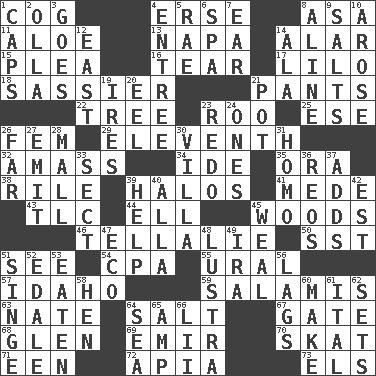 ACROSS 1. Gear tooth 4. Celtic language 8. White ___ sheet 11. Medicinal plant 13. California wine valley 14. Having or resembling wings 15. Entreaty 16. Separate forcefully 17. _ and Stitch 18. More lively and spirited 21. Leg coverings 22. Relationship diagram 23. Friend of Pooh 25. Compass dir. 26. Opposite of masc. 29. Veterans Day date 32. Collect or gather 34. Binary compound 35. Mouth or opening 38. Cause heat under the collar 39. Saint headwear 41. Ancient Persian 43. Affectionate concern, for short 44. Pipe bend 45. Forest 46. Copy Pinocchio 50. Fast jet (abbr.) 51. Perceive with the eye 54. Tax preparer (abbr.) 55. Mountain range 57. Potato state 59. Deli grouping 63. Nathan's nickname 64. Table seasoning 67. Yard entry 68. Small, secluded valley 69. Arab leader 70. Three-handed card game 71. Car or cant ending 72. Capital of Western Samoa 73. Raised railways DOWN 1. Smile enhancers 2. Spanish pot 3. Travels 4. Main course 5. Actress Charlotte 6. Health resort 7. Ewer handle 8. Place in a line 9. Table seasonings 10. Came up 12. Compass direction 14. Insect wing 19. Angers 20. Snakelike fish 21. Plant holder 23. Redecorate 24. Singles 26. At a great distance 27. Send forth 28. Promenade 30. Country residence 31. Same (prefix) 33. Religious group 36. Vintage cars 37. Does sums 39. Assist 40. Silent film actress Nazimova 42. Eastern Standard Time (abbr.) 45. Welt 47. Environmental prefix 48. A period of five years 49. Retirement account (abbr.) 51. Scorch 52. Peak District village in England 53. Ingested 56. Falls behind 58. Layer 60. Create 61. Slanted text style (abbr.) 62. Arranges properly for use 64. Ocean 65. Electrical Unit 66. Cards in a Roman deck?