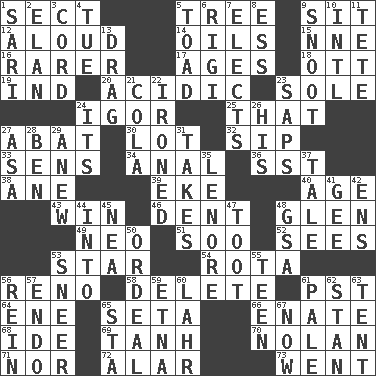 ACROSS 1. Religious group 5. Relationship diagram 9. Be seated 12. Verbally 14. Petroleums 15. Compass dir. 16. More valued for its uncommonness 17. Ripens 18. Baseball player Mel 19. Working for oneself (abbr.) 20. Being or containing an acid 23. Not divided or shared with others 24. Russian composer Stravinsky 25. Not this but _ 27. Blind as ____ 30. Car dealer's back yard 32. Small drink 33. Elected reps. 34. Of or related to the anus 36. Fast jet (abbr.) 38. One (Scot) 39. Supplement with great effort 40. Personal question 43. Victory 46. Undesirable depression on a surface 48. Small, secluded valley 49. Modern: prefix 51. "Barney Miller" actor Jack 52. Perceives with the eye 53. Play the lead 54. Round or rotation of duties 56. Former U.S. Attorney General Janet 58. Erase 61. Pacific Standard Time (abbr.) 64. Compass dir. 65. Stalk of a moss capsule 66. Maternal 68. Binary compound 69. Hyperbolic tangent 70. Pitcher Ryan 71. And not 72. Having or resembling wings 73. Gone DOWN 1. Indian skirt 2. Enthusiasm 3. Drawstring 4. Third day of the wk. 5. Frog relative 6. Swiss mountan, "Queen of the Mountains" 7. Chooses 8. Curvy letter 9. Snout, nose 10. International (abbr.) 11. False hair 13. To trail on the ground 21. Root beer relative 22. Pressed 23. Plant excrements 24. It is 26. Part of HMS, perhaps 27. White ___ sheet 28. Benjamin's nick name 29. Afresh 31. Receives possession of 35. Poe poem 37. Falsehood 41. Turn to the right 42. Followers of ems 44. To the inside or interior of 45. Teachers' org. 47. A blast of a horn 48. Girls' org. (abbr.) 50. Severe or trying experience 53. Scornful expression 55. Adolescent 56. It's straight from the horse's mouth 57. Inside; within (prefix) 59. Inactive volcano in Sicily 60. Cowardly lion portrayer 61. Diluted with white 62. Comedian Laurel of Laurel & Hardy 63. Portable shelter 65. R.R. building 67. At this time