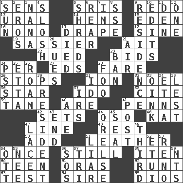 ACROSS 1. Elected reps. 5. Indian titles of respect 9. Redecorate 13. Mountain range 14. Equivocates 15. Genesis locale 16. Words to Nanette 17. Window treatment 18. Trig term 19. More disrespectful 21. Small island 22. Took on color 23. Auction offers 24. For each 27. Begley and Asner 28. Conductor's collection 29. Constricts 31. Electrically charged atom 32. Christmas carol 36. Play the lead 37. Wedding promise 38. Quote 39. Not wild 40. "We ___ not amused" (Victoria) 41. Actor Sean's family 42. Arranges properly for use 44. Bear (Spanish) 46. Krazy ___ of comics 47. Actor's bit 48. Repose 50. Increase 51. Cordwainer's material 54. Single time 56. Free from disturbance or agitation 58. Detail 60. Adolescent 61. Mouths or openings 62. Undersized animal 63. Trial 64. Male parent of an animal 65. "Vaya con ____" DOWN 1. Player for Phoenix 2. Greek god of love 3. Nanny 4. Splash clumsily 5. Fragments 6. Bring up, as a child 7. Naughty child 8. Compass dir. 9. Home 10. Prepares for publication 11. Lair 12. Single 17. Passed on 20. Institutes legal proceedings 21. Atmosphere 23. Prohibit 24. Inconspicuous attention getter 25. Singer James 26. Wander 28. Egg _ yung 30. Elected leader of a country 31. Binary compound 33. Pig sound 34. Inactive volcano in Sicily 35. For fear that 37. Big collection agency 40. Had dinner 41. Mail 43. Conclusion 44. Threatening words 45. Lick closed 47. Shoestrings 49. One of three equal parts 51. One who doesn't tell the truth 52. Needle case 53. Western Nevada city 54. Baseball player Mel 55. Born 56. Mayday 57. Three (prefix) 59. Mountains (abbr.)