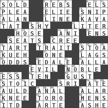 ACROSS 1. Exchanged or delivered for money 5. Confederate soldiers (slang) 9. Raised railways 12. Entreaty 13. Writer Wiesel 14. Clip 15. Actor Alda or Thicke 16. Actor's bit 17. Polynesian shrub of the pepper family 18. Make lace 19. Like a shrinking violet 21. 61 cubic inches 22. Stockings 24. Cuckoo 26. Followers of ems 27. Theater features 28. Algonquian 29. Small pie 30. Distinguishing feature 32. Portico 36. Malaysian steamed pastry 37. Single 38. Fails to keep up a pace 39. Probability 40. Peak District village in England 42. Silent film actress Nazimova 43. Morally bad or wrong 44. Impressive in appearance 46. Curvy letter 49. "___ Little Indians" 50. Abrupt rush of wind 51. Unemotional 53. Indian title of respect (Mr.) 54. Had dinner 57. Old (Scot.) 58. Of or related to the anus 61. Having or resembling wings 62. Leg joint 63. "Corrida" creature 64. Not women's 65. It would 66. Johnson of "Laugh-In" 67. American tennis player Robert DOWN 1. Petty quarrel 2. Rounded earthenware pot or jar 3. Resembling or made to resemble leather 4. Daniel's nick name 5. Have trust in 6. Biblical high priest 7. Storage container 8. Observe 9. Maternal 10. Make or become more lively 11. Practice fights 14. What Jean-Claude Killy likes to do 19. Fast jet (abbr.) 20. Command 21. Whopper 23. Profane or obscene expressions 24. Satellite of Uranus 25. Remaining after all deductions 27. Saudi Arabian king (1953-1964) 28. Lessep's creation 29. Ring climax 31. "The Thinker" sculptor 32. Thick slices 33. Baron Munchausen's specialties 34. Stare at amorously 35. White ___ sheet 40. Night before a holiday 41. Engineer (abbr.) 43. And so on (abbr.) 45. Fr. "Yes" 46. 1973 Nobel Price Winner (Physics) Leo 47. Difficult or unusual or dangerous feat 48. Having a sole or soles 52. Binary compound 53. _ gin 55. Hyperbolic tangent 56. Celtic language 58. "One Day ___ Time" 59. Not either 60. Tate display 61. Wet nurse (var.)