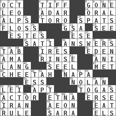 ACROSS 1. Sep. follower 4. Small quarrel 8. Went 12. Lion 13. The sixth month of the Jewish calendar 14. Taken by mouth 15. High mountains 17. "Corrida" creature 18. Arguments over trivial matters 19. Soft thread for cleaning between teeth 21. Girls' org. (abbr.) 23. Perceive with the eye 24. _____ Park, CO 26. Compass dir. 28. Suttee (variant) 30. Replies (to) 34. Keyboard key 37. Angers 39. Genesis locale 40. Housemaid (var.) 41. Remove soap 43. Black tropical American cuckoo 44. Austrian-born American filmmaker Fritz 46. Stitch closed the eyes of (a falcon) 47. Was introduced to 48. Leopard's kin 51. California wine valley 54. Double-curved letter 55. Pitcher Ryan 58. Flowery wreath 61. Fitting 63. Ancient Roman robes 65. Thespian 67. Inactive volcano in Sicily 71. Celtic language 72. SW Asia republic 73. Period of immesurable duration 74. Erode 75. General guideline 76. "Two Mules for Sister ____" 77. Raised railways DOWN 1. Norwegian king 2. Cell (Danish) 3. Traditional theme or motif 4. Make lace 5. Wedding promise 6. At a great distance 7. Toadlike animal 8. Grand Old Party 9. Mouths or openings 10. Nathan's nickname 11. Otherwise 16. Fast planes 18. Backtalk 20. Ocean 22. Elected rep. 25. Commotion 27. She-sheep 29. From or relating to Ireland 30. NE Netherlands city 31. Dutch treat 32. French philosopher Descartes 33. In a ____ (agitated or irritated) 34. Baby powder 35. Nursemaid 36. Object of repulsion 38. Compass dir. 42. Liveliness 45. Unit of force equal to gravity 49. Russian ruler of old 50. Viper 52. Cooking vessel 53. _ vera 56. Match 57. Relating to the nose 58. Den 59. Shade of tan 60. Slanted text style (abbr.) 62. Beverages made from leaves 64. Arranges properly for use 66. Single 68. Afternoon social gathering 69. And not 70. Santa ___, CA
