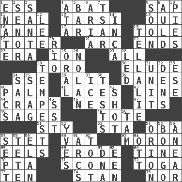 ACROSS 1. Double-curved letter 4. Blind as ____ 8. Plant excrement 11. Be tempered by heat 13. Tarsus (plural) 15. Fr. "Yes" 16. Queen of England 1702-14 17. Believer in; advocate of (suffix) 18. Lacquered or enameled metalware 19. Carrier 21. Curve 22. Extremities 23. Epoch 24. Electrically charged atom 27. 100% 29. "Corrida" creature 30. Dodge 34. Compass dir. 36. Came down and settled, as after flight 39. Natives or inhabitants of Denmark 40. Inside of hand 41. Shoestrings 43. Actor's bit 44. Dice game 46. Tender 47. ___ a Wonderful Life 48. Gurus 49. Carryall 51. Filthy place 53. R.R. building 54. Chief or king in Benin or Nigeria 57. Proofreading order 60. Large container 63. Person of subnormal intelligence 65. Snakelike fish 66. Wear away 69. Prong on a fork 70. Parent Teacher Assoc. 71. Biscuitlike quick bread 72. Ancient Roman robe 73. "___ Little Indians" 74. Comedian Laurel of Laurel & Hardy 75. Not either DOWN 1. Related on the mother's side 2. Sir (Sp.) 3. Before Barbara or Clara 4. _ moment's notice (2 wds.) 5. Oblong piece of solid material 6. Operatic vocal solo 7. Russian ruler of old 8. Within a short period 9. Old (Scot.) 10. Sliced desserts 12. Area sheltered from the wind 14. South American Indian 18. Copy Pinocchio 20. _ de Janeiro 25. Spoken 26. Pitcher Ryan 28. Directed 29. Storms 31. A single undivided whole 32. Hiding places for outlaws 33. Compass dir. 34. "Two Mules for Sister ____" 35. Volcanic refuse 37. Frozen water 38. Trials 40. Personal Computers (abbr.) 42. Guess 45. Fast jet (abbr.) 50. Scottish cap 52. Jacques Cousteau's middle name 54. Greek mythologigal hunter 55. Beat drum 56. Approach 57. Back-to-school mo. 58. Wig 59. Flair 61. Arches 62. A blast of a horn 64. Baseball player Mel 67. Heredity factor (abbr.) 68. Car or cant ending