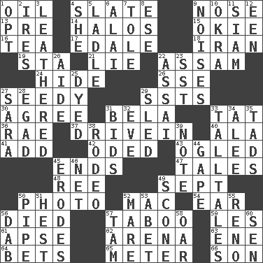 ACROSS 1. Petroleum 4. Chalkboard 9. Characteristic smell of wine 13. Before (prefix) 14. Auras 15. Migrant worker of the '30s 16. Afternoon social gathering 17. Peak District village in England 18. SW Asia republic 19. R.R. building 21. Untruth 22. Indian state 24. Flintstone garb 26. Compass dir. 27. Full of seeds 29. Fast planes 30. Match 31. Actor Lugosi 33. Make lace 36. Actress Charlotte 37. Popular '50s hangout 40. Wing 41. Say or write further 42. Wrote a lyric poem 43. Stared 45. Conclusions 47. Falsehoods 48. To riddle 49. Back-to-school mo. 50. Picture 52. Apple computer (short form) 54. Hearing organ 56. Passed on 57. Off limits 59. French article 61. Domed church section 62. Sports stadium 63. Compass dir. 64. Antes 65. Distance measurement 66. Boy, to dad DOWN 1. Choose 2. Angers 3. Resembling or made to resemble leather 4. A female animal or person 5. Dipping utensil 6. Jai _ 7. Lacquered or enameled metalware 8. Compass dir. 9. Annoying sounds 10. Gumbo ingredient 11. Thailand, formerly 12. Car or cant ending 20. Helper 22. Slender Brazilian palm 23. Fast jet (abbr.) 25. Colored 27. "Two Mules for Sister ____" 28. Mild oath 29. Downhill vehicle 31. Auction offers 32. First lady 33. Baron Munchausen's specialties 34. Toward shelter 35. Bits 38. Cowboy competition 39. Short letter 44. Open wide 45. Eats (away) 46. Remaining after all deductions 49. Biscuitlike quick bread 50. Corncob 51. Command 52. Female horse 53. Collude with 55. Former U.S. Attorney General Janet 56. Pat or tap gently 57. Scottish cap 58. Boat paddle 60. Elected rep.