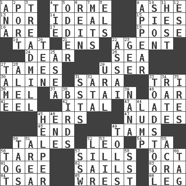 ACROSS 1. Fitting 4. Singer Mel 9. American tennis player Robert 13. And not 14. Perfect 15. Sliced desserts 16. "We ___ not amused" (Victoria) 17. Proofreads 18. Airs 19. Make lace 21. Followers of ems 22. Rep 24. Letter starter 26. Ocean 27. Domesticates 29. One who uses or employs something 30. Place in a line 31. "Two Mules for Sister ____" 33. Three (prefix) 36. Cartoonist voice _ Blanc 37. Choose not to consume 40. Rowing implement 41. Snakelike fish 42. Slanted text style (abbr.) 43. Having winglike extensions 45. Possessive pronoun 47. Unclothed pictures 48. Conclude 49. Scottish caps 50. Stories 52. Lion 54. Parent Teacher Assoc. 56. Canvas cover 57. Beverly of Met fame 59. Sep. follower 61. Double curve, resembling the letter S 62. Travels by water 63. Mouth or opening 64. Russian ruler of old 65. Obtain by seizing forcibly or violently 66. Part of a journey DOWN 1. Santa ___, CA 2. Left side of a ship or aircraft 3. Excercise machine 4. Neckwear 5. More peculiar 6. It's straight from the horse's mouth 7. Floor coverings 8. Raised railways 9. Become visible 10. The Jewish people; Israel 11. Command 12. Compass dir. 20. Adolescent 22. Slender Brazilian palm 23. Turn to the right 25. Toward the sea 27. Not wild 28. Toward shelter 29. Mountain range 31. Fast planes 32. _ moment's notice (2 wds.) 33. Inedible or poisonous agaric 34. Pace 35. Angers 38. Avian creatures 39. Nanny 44. Mass 45. Assistant 46. Compass dir. 49. For Whom the Bell _____ 50. Labels 51. Type of rug 52. One who doesn't tell the truth 53. Writer Wiesel 55. Measure of real estate 56. Small child 57. Compass dir. 58. Fast jet (abbr.) 60. Label