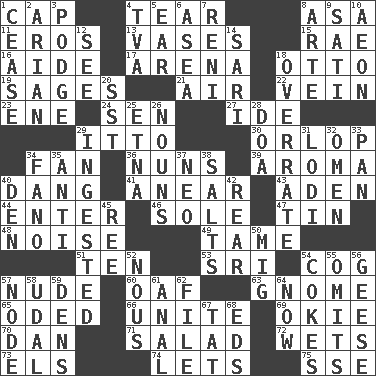 ACROSS 1. Head covering 4. Pull apart 8. White ___ sheet 11. Greek god of love 13. Flower holders 15. Actress Charlotte 16. Assistant 17. Sports stadium 18. "Beetle Bailey" pooch 19. Gurus 21. Atmosphere 22. Distinctive style or manner 23. Compass dir. 24. Elected rep. 27. Binary compound 29. "Tell ____ the Marines!" 30. Lowest deck of a ship 34. Avid follower 36. Religious women 39. Scent 40. Mild oath, euphamism for damn 41. Approach 43. Arabian gulf 44. Keyboard key 46. Not divided or shared with others 47. Shallow baking pan 48. Annoying sound 49. Docile 51. Nine, plus one 53. _ Lanka 54. Gear tooth 57. Naked 60. Clumsy lout 63. Dwarf 65. Wrote a lyric poem 66. Join together 69. Migrant worker of the '30s 70. Daniel's nick name 71. First course 72. Moistens 73. Raised railways 74. Allows 75. Compass dir. DOWN 1. Stop 2. Believer in; advocate of (suffix) 3. Puddle 4. Federal power corp. 5. Hearing organ 6. At sea 7. Painter Guido (1575-1642) 8. Johnson of "Laugh-In" 9. Suttee (variant) 10. A really long time 12. Observe 14. Indian skirt 18. Make much ado about nothing 20. Fast jet (abbr.) 25. Inactive volcano in Sicily 26. Parts of speech 28. ___ good deed 29. Eaten 31. Farming town in central California 32. Sign of things to come 33. Baking dish 34. Papal veil 35. Against 37. Modern: prefix 38. Table seasonings 40. Lair 42. Located in or toward the back 45. To riddle 50. Russian fighter aircraft 52. Horse sense 54. Popular sodas 55. Leaves out 56. Honkers 57. Thickened enlargement 58. Freehold land 59. Cub Scout units 61. Of or related to the anus 62. Do some clerical work 64. At this time 67. Make lace 68. Begley and Asner