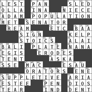 ACROSS 1. For fear that 5. Baking dish 8. Downhill vehicle 12. Spanish pot 13. _ tizzy (2 wds.) 14. Sibling's daughter 15. First of billions? 16. Census information 19. Was introduced to 20. Legislator 21. 480, 500 or 516 sheets of paper 23. And so on (abbr.) 24. Sound made by sheep 27. Attach a signature 30. Seaweed 31. Unemotional ones 34. Mountain range southwest of Kyrgyzstan 35. Indonesian resort city 38. Food holder 40. Grandmother 41. The front part of a cuirass 42. Eats (away) 44. Portable shelter 45. "____ silly question..." 46. Compass dir. 47. Big _ 50. He sold his birthright 53. Speakers 57. Compass dir. 59. Supplementary 63. Roberta Peters solo 64. First name in cosmetics 65. Animal enclosure 66. "Vaya con ____" 67. Lacerate 68. Working for oneself (abbr.) 69. Gouge DOWN 1. Rich soil 2. A person who is older than you are 3. Schedule 4. Scottish cap 5. Corncob 6. Soon (poet.) 7. California wine valley 8. Be seated 9. Flowery wreath 10. Environmental prefix 11. Lair 14. Drug cop 17. Shoshoni 18. Car dealer's back yard 20. Stricken, poetically 22. Aid 24. Actor Lugosi 25. Actor Alda or Thicke 26. Capital of Western Samoa 28. Republican Party 29. "Death on the ____" 30. Sunflower state 32. 4-wheeled motor vehicle 33. Portico 35. Wagers 36. Eras 37. Actor's bit 39. Begley and Asner 43. Makes supply last 47. Undercover agent 48. "We ___ not amused" (Victoria) 49. Feline 51. Nest on high 52. The state of being joined or united 54. Native american tent (variation) 55. Baking chamber 56. Tear apart 58. 90 degrees 59. Put into a specified state 60. Purpose 61. Parent Teacher Association (abbr.) 62. For each 63. Say or write further