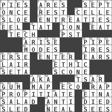 ACROSS 1. Sliced desserts 5. Ancient Greek god of war 9. Back-to-school mo. 13. Single time 14. Relief 15. Cell (Danish) 16. A type of plum 17. Pleas 19. Snakelike fish 20. Make lace 21. Electrically charged atom 22. Consume 23. Georgia ____ (Atlanta school) 25. Pacific Standard Time (abbr.) 26. Originate 30. Corncob 34. Methods 35. Angers 36. Celtic language 39. Keyboard key 42. Hearing organs 43. Den 44. Principle of right and wrong 46. Stalk of a moss capsule 47. Biscuitlike quick bread 48. Alias (abbr.) 51. Russian ruler of old 54. Chewing product 57. Atlas unit 58. Environmental prefix 60. Hit sharply and swiftly 62. Appease 65. Inactive volcano in Sicily 66. First course 67. Opposed to 68. Passed on 69. Downhill vehicle 70. Actress Patricia 71. Perceives with the eye DOWN 1. Airs 2. An arm off of a larger body of water 3. Learning spot: Fr. 4. Observe 5. Length times width 6. Monthly bill 7. Eastern Standard Time (abbr.) 8. Remove all contents or possession from 9. Arrange properly for use 10. Writer Wiesel 11. Entreaty 12. Trial 15. Patter 18. Greek goddess of the dawn 20. Through, poetically 24. Device for capturing images 27. Binary compound 28. Elected rep. 29. _____ Park, CO 30. Components 31. Lyricist Gershwin 32. For each 33. Double-curved letter 36. Raised railways 37. Actress Charlotte 38. Be seated 40. And so on (abbr.) 41. 17th letter of the Greek alphabet 45. To the inside or interior of 48. Among 49. Krazy ___ of comics 50. Bee-related 52. Nick name for Arthur 53. Indian princess (variant) 54. Global Positioning Systems (abbr.) 55. Mountain range 56. Undercover agent 58. Singer James 59. To provide with a ceiling 61. Groovy apts. 63. Groovy apt. 64. One (Scot) 65. Begley and Asner