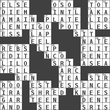 ACROSS 1. Otherwise 5. Bear (Spanish) 8. Small child 11. South Vietnam president (1954) 12. International (abbr.) 14. Alias (abbr.) 15. At full speed 17. Food holder 18. Hat (slang) 19. Small, flat, pigmented spot on the skin 21. Cooking vessel 22. French article 23. Curvy letter 24. Infant locale 25. Be seated 27. Snakelike fish 28. Nathan's nickname 31. Confederate soldiers (slang) 35. Mouth edge 37. Secret move to avoid paying debts 38. Prepare for publication 39. Non-commissioned officer (abbr.) 41. Monthly bill 42. _ and Stitch 43. _ Lanka 45. At sea 46. Shout 47. Curve 49. Benjamin's nick name 51. Afternoon social gathering 52. Title for a knight 55. Friend of Pooh 57. Eastern Standard Time (abbr.) 60. Gist 62. Lyricist Gershwin 63. Fragment 65. Leg joints 66. Slender fish 67. Adolescent 68. Gouge 69. Plus 70. Perceive with the eye 71. Indian titles of respect DOWN 1. Peak District village in England 2. Citrus fruits 3. Actors Connery and Penn 4. Send forth 5. Lubricate 6. Fastener 7. "Beetle Bailey" pooch 8. Baron Munchausen's specialties 9. Migrant worker of the '30s 10. Small amounts or degrees 13. Allows 16. The longest river in the world 17. Cotton for raincoats, e.g. 20. Highlander 26. Kind of red light 29. Prong on a fork 30. Singer James 31. Have confidence or faith in 32. Singer Brickell 33. Big road sign 34. Fur scarf 36. Personal Computers (abbr.) 40. Spoke pompously 44. Angers 48. Keg 50. A home for chicks 52. Scornful expression 53. Ancient Celtic tribe of eastern Britain 54. Musical pauses 55. Port city in Latvia 56. NW Algerian seaport 58. "______ My Girl" (Turtles hit) 59. Woody plant 61. Conclusions 64. Compass dir.