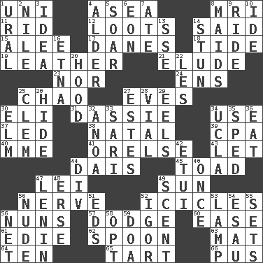 ACROSS 1. Single; one (prefix) 4. At sea 8. Medical imaging device (abbr.) 11. To free from 12. Plunders 14. Expressed in words 15. Toward shelter 17. Natives or inhabitants of Denmark 18. Periodic rise and fall of the sea level 19. Cordwainer's material 21. Dodge 23. And not 24. Followers of ems 25. US Secretary of Labor Elaine L. _ 27. Nights before holidays 30. Biblical high priest 31. Hyrax 34. Purpose 37. Directed 38. Brizilian seaport 39. Numbers guy (abbr.) 40. Madame (abbr.) 41. Threatening words 43. Allow 44. Raised platform 45. Frog relative 47. Luau accessory 49. Player for Phoenix 50. Boldness 52. Winter's stalactites 56. Religious women 57. Evade 60. Relaxation 61. Singer Brickell 62. Soup utensil 63. Floor covering 64. "___ Little Indians" 65. Small pie 66. Fluid product of inflammation DOWN 1. Mountain range 2. "Death on the ____" 3. The content of cognition 4. Tree or shrub in the Birch family 5. Fly high 6. A really long time 7. Had dinner 8. Unmarried girls 9. Travel on or in a vehicle 10. Binary compound 13. Compass dir. 14. Make senseless or dizzy 16. Inactive volcano in Sicily 20. Parka part 22. French article 25. Clement's nick name 26. Flintstone garb 27. _____ Park, CO 28. Small bottle 29. Snakelike fish 30. Shade tree 32. Small Philippine buffalo 33. Indian skirt 34. Southern CA. univ. 35. Moved rapidly 36. Erode 42. Needle case 44. HTML Container Element 46. At one time in the past 47. Soviet premier 1918-24 48. Celtic language 49. Aroma 50. Unadorned 51. Begley and Asner 52. Composer Stravinsky 53. Desk light 54. Son of Isaac 55. Arranges properly for use 56. Remaining after all deductions 58. Choose 59. ___ good deed