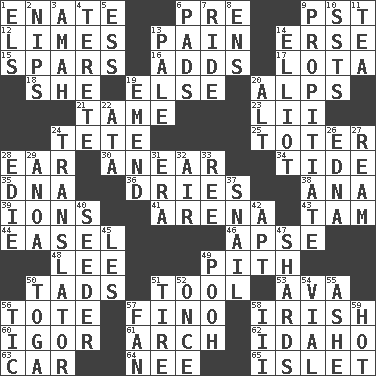 ACROSS 1. Maternal 6. Before (prefix) 9. Pacific Standard Time (abbr.) 12. Citrus fruits 13. Ache 14. Celtic language 15. Practice fights 16. Sums up 17. Globular water bottle used in Asia 18. A female animal or person 19. Otherwise 20. High mountains 21. Docile 23. Cards in a Roman deck? 24. Wig 25. Carrier 28. Ewer handle 30. Approach 34. Event that recurs at intervals 35. Heredity factor (abbr.) 36. Frees from moisture 38. Santa ___, CA 39. Charged particles 41. Sports stadium 43. Scottish cap 44. Artist's stand 46. Domed church section 48. Area sheltered from the wind 49. Heart or essence 50. Small amounts or degrees 51. Implement 53. Actress Gardner 56. Carryall 57. Fine (Spanish) 58. From or relating to Ireland 60. Russian composer Stravinsky 61. Bowlike part 62. Potato state 63. Auto 64. Born 65. Small island DOWN 1. Raised railways 2. Pinches, bites 3. Wet nurse 4. Cigar-shaped 5. Curvy letter 6. Writing tablets 7. Travel on an animal 8. Followers of ems 9. Appease 10. Fast planes 11. Beverage made from leaves 13. Light colored 14. American author Paul (1891-1958) 19. Make improvements or corrections to 20. Keyboard modifier key 22. "One Day ___ Time" 24. Interpreter 26. Pulitzer Prize-winning author Ferber 27. 480, 500 or 516 sheets of paper 28. Singer Brickell 29. Small Philippine buffalo 31. Period 32. Atmosphere 33. To riddle 37. Slow-paced one 40. Sowing specialist 42. Fitting 45. French article 47. Pottery fragments 49. "Silly old bear" 50. Ancient Roman robe 51. Hoop that covers a wheel 52. At one time in the past 54. Small bottle 55. American tennis player Robert 56. Nervous spasm 57. Avid follower 58. One more than two 59. Being at a high temperature