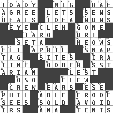 ACROSS 1. Sycophant 6. Russian fighter aircraft 9. Actress Charlotte 12. Match 13. Allows 14. Elected reps. 15. Allots cards 16. The content of cognition 17. Religious women 18. Sight organ 19. Clement's nick name 20. Went 21. Edible starchy tuberous root 23. RI univ. 24. Bristle 25. Catcalls? 28. Connecticut Ivy Leaguer 30. Showery time 34. Fastener 35. Label 36. Locates 38. Lyricist Gershwin 39. Prong on a fork 41. More peculiar 43. Fast jet (abbr.) 44. Believer in; advocate of (suffix) 46. For fear that 48. Bear (Spanish) 49. Soared 50. Ship's personnel 51. Hearing organs 53. Compass dir. 56. Silvers or Donahue 57. Competent 58. Eat (away) 60. Observes 61. Disposed of to a purchaser 62. Keep away from 63. Big collection agency 64. Santa ___, CA 65. Portable shelters DOWN 1. Bit 2. Double curve, resembling the letter S 3. Like ___ of sunshine 4. Erase 5. Consenting reply 6. Ancient Persian 7. Detail 8. Girls' org. (abbr.) 9. One who advocates reunion 10. Singer Murray 11. Double-curved letter 13. _ and Stitch 14. Sounds asleep 19. Dice game 20. Chewing product 22. "One Day ___ Time" 24. Seigniories (variant) 26. Armed conflicts 27. Argument over a trivial matter 28. Singer James 29. Den 31. River (Sp.) 32. It would 33. Directed 37. Exchanges for money 40. Artist's stands 42. To riddle 45. Immediately 47. Turn aside suddenly 49. Flintstone 50. "Mermaids" star 51. Inky black, to poets 52. Silent film actress Nazimova 54. Within a short period 55. Prepare for publication 56. Air pressure measure (abbr.) 57. White ___ sheet 58. Erode 59. Begley and Asner