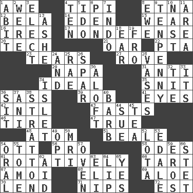 ACROSS 1. Deep reverence 4. Native american tent (variation) 8. Inactive volcano in Sicily 12. Actor Lugosi 14. Paradise 15. Put on (as clothing) 16. Angers 17. Unrelated to defense, as in spending 20. Technical 21. Boat paddle 22. Parent Teacher Association (abbr.) 23. Pulls into pieces 27. Be footloose 29. California wine valley 31. Opposed to 34. Perfect 35. In a ____ (agitated or irritated) 36. Backtalk 39. Director Reiner 41. Sight organs 42. International (abbr.) 43. Goes without food and/or water 46. Become fatigued 47. Loyal 48. Tiny particle 51. Calif. Air Force Base 54. Baseball player Mel 56. Adept person 58. Lyric poems 61. Rotating or pertaining to rotation 66. Small pie 67. Mine, in Marseilles 68. Writer Wiesel 69. Medicinal plant 70. Grant temporary use of 71. Cuts off 72. Eastern Standard Time (abbr.) DOWN 1. "This won't hurt ____!" 2. Past tense of be (plural) 3. Choose 4. "___ Little Indians" 5. Wedding promise 6. Fenced enclosure 7. Southeast Asian peninsula 8. She-sheep 9. 3-inch nail 10. Political cartoonist Thomas 11. Length times width 13. American tennis player Robert 18. Ewer handle 19. Away 24. Added to 25. Actress Charlotte 26. Coast Guard woman 28. Flower holders 30. High up in or into the air 32. Standoff 33. It is 34. Small island 36. Be seated 37. Black tropical American cuckoo 38. Ski resort town in Vermont 40. Sharp remark 44. Take to court 45. Beverage made from leaves 49. Elect 50. Medical imaging device (abbr.) 52. Globular water bottle used in Asia 53. Peak District village in England 54. Of the mouth 55. Heavy book 57. Baking chamber 59. Greek god of love 60. Proofreading order 62. Help 63. Connecticut Ivy Leaguer 64. Mouth edge 65. It is so