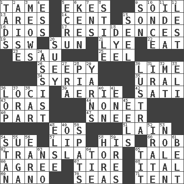 ACROSS 1. Docile 5. Makes supply last 9. The visible part of the earth's surface 13. Ancient Greek god of war 14. Penny 15. Message 16. "Vaya con ____" 17. Dwellings 19. Compass dir. 20. Player for Phoenix 21. Sodium hydroxide 22. Erode 23. Son of Isaac 25. Snakelike fish 26. Not well drained, as in land 30. Citrus frut 34. Damascus' land 35. Mountain range 36. Venues 39. Nest on high 42. Suttee (variant) 43. Mouths or openings 44. Music written for nine 46. Role in a play 47. Scornful expression 48. Greek goddess of the dawn 51. (Had) reclined 54. Institute legal proceedings 57. Mouth edge 58. Part of HMS, perhaps 60. Director Reiner 62. Interpreter 65. Story 66. Match 67. Become fatigued 68. Slanted text style (abbr.) 69. Billionth: prefix 70. Oceans 71. Portable shelter DOWN 1. Small boys 2. Ascend 3. Catcalls? 4. Curvy letter 5. Shade of tan 6. Peachy ____! 7. Followers of ems 8. Vertical member of a panel or frame 9. Manchild 10. Single time 11. It may be bright or harebrained 12. For fear that 15. Stitch closed the eyes of (a falcon) 18. Color 20. Chop _ 24. Aid 27. Epoch 28. Sliced dessert 29. Tall tales 30. A period of five years 31. Retirement account (abbr.) 32. Floor protector 33. Biblical high priest 36. Trim (branches) 37. Mouth or opening 38. 4-wheeled motor vehicle 40. Electrically charged atom 41. Compass dir. 45. Snakelike fish 48. Otherwise 49. Petroleum 50. Arguments over trivial matters 52. Feeling or showing extreme anger 53. Pitcher Ryan 54. Comedian Laurel of Laurel & Hardy 55. Capital and largest city of Mongolia 56. Merit 58. Israeli folk dance 59. Angers 61. Waist strap 63. Modern: prefix 64. Standoff 65. Teat (slang)