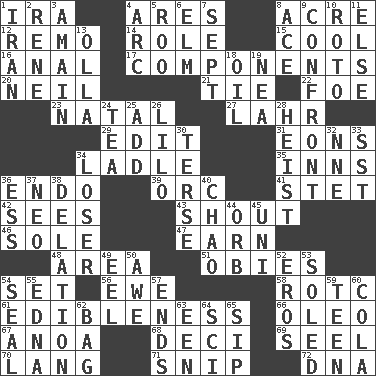 ACROSS 1. Lyricist Gershwin 4. Ancient Greek god of war 8. 1/640 square mile 12. San ____ (Riviera town) 14. Hero or heavy, e.g. 15. Calm and collected 16. Of or related to the anus 17. Pieces 20. Famous astronaut Armstrong 21. Make a knot 22. Enemy 23. Relating to or accompanying birth 27. Cowardly lion portrayer 29. Prepare for publication 31. Immeasurably long periods of time 34. Dipping utensil 35. Restaurants 36. Inside; within (prefix) 39. The grampus (Milton) 41. Proofreading order 42. Observes 43. Yell 46. Not divided or shared with others 47. Merit 48. Type of rug 51. Off-Broadway awards 54. Arrange properly for use 56. She-sheep 58. College mil. group 61. The property of being fit to eat 66. Margarine 67. Small Philippine buffalo 68. Tenth: prefix 69. Stitch closed the eyes of (a falcon) 70. Long (Scottish) 71. Sever or remove by pinching or nipping 72. Heredity factor (abbr.) DOWN 1. SW Asia republic 2. French philosopher Descartes 3. At full speed 4. Curve 5. Friend of Pooh 6. Shade tree 7. Back-to-school mo. 8. Adept person 9. Meet 10. Printing process, for short 11. Otherwise 13. Rounded earthenware pot or jar 18. Lubricate 19. Teachers' org. 24. Afternoon social gathering 25. Find the sum of 26. _ and Stitch 28. Robbery 30. Laconic 32. Compass dir. 33. Fast jet (abbr.) 34. Failure 36. Double-curved letter 37. Modern: prefix 38. Conveyance 40. US Secretary of Labor Elaine L. _ 44. Globe 45. Corn or form start 49. Snakelike fish 50. Deep reverence 52. Greek god of love 53. Having a sole or soles 54. Lick closed 55. Pulitzer Prize-winning author Ferber 57. Extremities 59. Adolescent 60. Root beer relative 62. Paper or plastic container 63. Car or cant ending 64. _-fi 65. Small drink