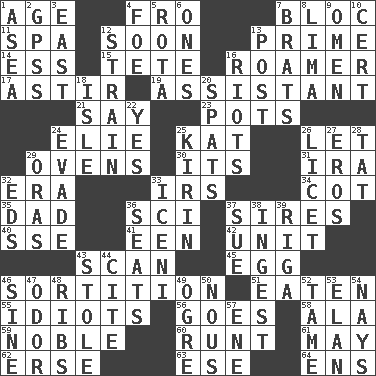 ACROSS 1. Ripen 4. From 7. Group of countries in special alliance 11. Health resort 12. Within a short period 13. A-one 14. Curvy letter 15. Wig 16. Wanderer 17. Moving about 19. Aide 21. Declare 23. Plant holders 24. Writer Wiesel 25. Krazy ___ of comics 26. Allow 29. Baking chambers 30. ___ a Wonderful Life 31. Retirement account (abbr.) 32. Epoch 33. Big collection agency 34. Small bed 35. June honoree 36. _-fi 37. Founders of families 40. Compass dir. 41. Car or cant ending 42. A single undivided whole 43. Glance over 45. Ovum 46. Decision 51. Ingested 55. Foolish or stupid persons 56. Travels 58. Insect wing 59. Impressive in appearance 60. Undersized animal 61. Fifth month 62. Celtic language 63. Compass dir. 64. Followers of ems DOWN 1. Toward the sea 2. Global Positioning Systems (abbr.) 3. Compass direction 4. Enemy 5. Round or rotation of duties 6. Singles 7. Naughty children 8. Pale green bean 9. Sign of something about to happen 10. An absolute certainty 12. Put through a sieve 13. Mail 16. Debaucheries 18. Capri or Wight 20. Arguments over trivial matters 22. It is so 24. Dodge 25. Japanese brewing company 26. It is permitted: Lat. 27. Greek god of love 28. Make lace 29. Mouths or openings 32. Begley and Asner 33. Ancient Celtic tribe of eastern Britain 36. Theater features 37. Take to court 38. Eat 39. Capital of Latvia 43. Took without asking 44. Quote 46. Trig term 47. Scent 48. Teases 49. Legendary monster 50. Common sense 52. Not wild 53. Flair 54. Negative votes 57. Compass dir.