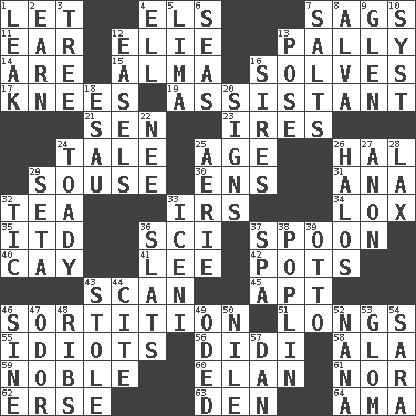 ACROSS 1. Allow 4. Raised railways 7. Droops 11. Ewer handle 12. Writer Wiesel 13. Friendly 14. "We ___ not amused" (Victoria) 15. _ mater 16. Finds the solution 17. Leg joints 19. Helper 21. Elected rep. 23. Angers 24. Story 25. Mature 26. Actor Linden 29. Boozer 30. Followers of ems 31. Santa ___, CA 32. Afternoon social gathering 33. Big collection agency 34. Brine-cured salmon 35. It would 36. _-fi 37. Soup utensil 40. Island 41. Area sheltered from the wind 42. Cooking vessels 43. Examine minutely or intensely 45. Fitting 46. Determination 51. Yearns 55. Foolish or stupid persons 56. "You Light Up My Life" star Conn 58. Chicken ___ king 59. Having high moral qualities 60. Enthusiasm 61. Not either 62. Celtic language 63. Lair 64. Wet nurse (var.) DOWN 1. Path through which fluid escapes 2. Merit 3. Woody plant 4. Pipe bend 5. Pale green bean 6. Oceans 7. Table seasonings 8. Inventor's middle name 9. Small, secluded valley 10. System (abbr.) 12. Artist's stands 13. Introduce or present, as a question 16. Titles for men of rank and authority 18. Son of Isaac 20. Omens 22. Born 24. Sycophant 25. Nest on high 26. Auras 27. Soon (poet.) 28. Not strict 29. Stalk of a moss capsule 32. Nervous spasm 33. Ancient Celtic tribe of eastern Britain 36. Narrow boards 37. Health resort 38. Cotton for raincoats, e.g. 39. Von Bismarck 43. Took without asking 44. Quote 46. Trig term 47. Scent 48. Teases 49. Wrote a lyric poem 50. "Death on the ____" 52. Nanny 53. Seize upon or latch onto something 54. "Two Mules for Sister ____" 57. Daniel's nick name