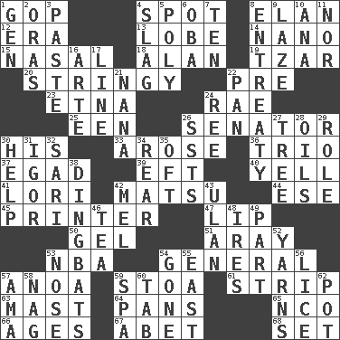 ACROSS 1. Grand Old Party 4. Specific locale 8. Style 12. Epoch 13. Ear part 14. Billionth: prefix 15. Rhinal 18. Actor Alda or Thicke 19. Russian ruler 20. Slender, wiry 22. Before (prefix) 23. Inactive volcano in Sicily 24. Actress Charlotte 25. Car or cant ending 26. Legislator 30. Part of HMS, perhaps 33. Came up 36. Musical group of three 37. Mild oath 39. Newt 40. Shout 41. Australian parrot (variant) 42. Taiwanese island in East China Sea 44. Compass dir. 45. Hard copy producer 47. Mouth edge 50. Set 51. Like ___ of sunshine 53. Basketball assoc. 54. Commissioned military rank 57. Small Philippine buffalo 59. Portico 61. Empty completely 63. Vertical spar for supporting sails 64. Baking dishes 65. Non-commissioned officer (abbr.) 66. Eons 67. Collude with 68. Arrange properly for use DOWN 1. Commissioned mil. rank 2. Mouths or openings 3. Thick mixture 4. Volcanic refuse 5. Many (prefix) 6. Chief or king in Benin or Nigeria 7. "___ Little Indians" 8. Plea 9. Goldbrick 10. Santa ___, CA 11. And not 16. Johnson of "Laugh-In" 17. Actor's bit 21. Nanny 22. Baking dish 24. To riddle 26. Fast planes 27. Family _ (genealogy) 28. Petroleums 29. Hero or heavy, e.g. 30. Assist 31. Russian composer Stravinsky 32. Indian skirt 34. Tail end 35. Often (poetically) 38. Empty-headed or silly people 42. Cartoonist voice _ Blanc 43. ____ Bator, Mongolia 46. Afternoon social gathering 48. Angers 49. Component 52. Entertaining tales 53. Characteristic smell of wine 54. Went 55. 90 degrees 56. Louse (plural) 57. Wet nurse (var.) 58. Tired old horse 59. Health resort 60. Keyboard key 62. Cooking vessel