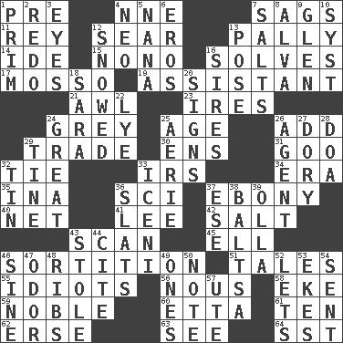 ACROSS 1. Before (prefix) 4. Compass dir. 7. Droops 11. Marina Del _, California 12. Scorch 13. Chummy 14. Binary compound 15. Words to Nanette 16. Finds the solution 17. With motion or animation 19. Aide 21. Leather borer 23. Angers 24. Jennifer or Joel 25. Mature 26. Increase 29. Exchange 30. Followers of ems 31. Thick or sticky substance 32. Standoff 33. Big collection agency 34. Epoch 35. _ tizzy (2 wds.) 36. _-fi 37. Dark wood 40. Remaining after all deductions 41. Area sheltered from the wind 42. Table seasoning 43. Glance over 45. Pipe bend 46. Casting lots 51. Lies 55. Foolish or stupid persons 56. Good sense 58. Make supply last 59. Having high moral qualities 60. Singer James 61. Nine, plus one 62. Celtic language 63. Perceive with the eye 64. Fast jet (abbr.) DOWN 1. Demure 2. Redecorate 3. Snake ____ (dice throw) 4. Modern: prefix 5. Grandmother 6. Greek god of love 7. Table seasonings 8. Inventor's middle name 9. Small, secluded valley 10. System (abbr.) 12. Overwhelmed 13. Airs 16. Titles for men of rank and authority 18. "Two Mules for Sister ____" 20. Public displays of written messages 22. Sodium hydroxide 24. Relatively large 25. Nest on high 26. Rep 27. Small, narrow, flatbottom fishing boat 28. ___ good deed 29. Prong on a fork 32. Metal container 33. Ancient Celtic tribe of eastern Britain 36. Narrow boards 37. Compass dir. 38. Greek mezzo-soprano Agnes 39. Spanish pot 43. Fur scarf 44. Quote 46. Trig term 47. Scent 48. Chest bones 49. Washington bills 50. Musical sound 52. Allows 53. Makes supply last 54. Emitted 57. Shoshoni