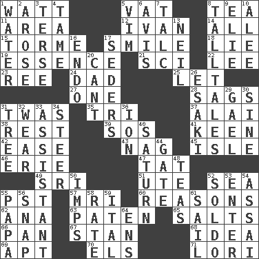 ACROSS 1. Electrical Unit 5. Large container 8. Afternoon social gathering 11. Type of rug 12. _ the terrible 14. Everything 15. Singer Mel 17. Grin 18. Falsehood 19. Substance 21. _-fi 22. Area sheltered from the wind 23. Portuguese money of account (variant) 24. June honoree 25. Allow 27. Single 28. Sinks 31. It was, poetically 35. Three (prefix) 37. Mountain range southwest of Kyrgyzstan 38. Relief 39. Mayday 41. Peachy ____! 42. Relaxation 43. Tired old horse 45. Capri or Wight 46. One of the Great Lakes 47. Make lace 49. Indian title of respect (Mr.) 51. Shoshoni 52. Ocean 55. Pacific Standard Time (abbr.) 57. Medical imaging device (abbr.) 60. Thinks logically 62. Santa ___, CA 63. Eucharist need 65. Table seasonings 66. Baking dish 67. Comedian Laurel of Laurel & Hardy 68. It may be bright or harebrained 69. Fitting 70. Raised railways 71. Australian parrot (variant) DOWN 1. Wetness 2. Came up 3. Laconic 4. Docile 5. Zeal 6. Advice 7. Baby powder 8. Baron Munchausen's specialties 9. Writer Wiesel 10. Toward shelter 13. Famous astronaut Armstrong 16. Inside; within (prefix) 17. Spring feasts 20. Patter 26. 1973 Nobel Price Winner (Physics) Leo 29. Highlander 30. Trig term 31. Family _ (genealogy) 32. Erode 33. Helper 34. Navigate 36. Electrically charged atom 40. Titan orbits this 44. Yard entry 48. Beverages made from leaves 50. Naughty children 52. Twentieth part of a lira 53. Keyboard key 54. Slender Brazilian palm 55. Dad 56. Fastener 58. Pace 59. Slanted text style (abbr.) 61. Travel by water 64. Followers of ems