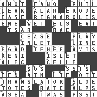 ACROSS 1. Mine, in Marseilles 5. Papal veil 9. Silvers or Donahue 13. Path through which fluid escapes 14. Having or resembling wings 15. Eat (away) 16. Relaxation 17. Complicated, petty procedures 19. Compass dir. 20. Soggy 21. Raised railways 22. Ingest 23. Russian ruler of old 25. Actress Charlotte 26. Stop 30. Shaw product 34. An arm off of a larger body of water 35. Actor's bit 36. Mild oath 39. Giggle 42. Opinion 43. Painter Guido (1575-1642) 44. Small island 46. Actor Baldwin 47. Cell (Danish) 48. Mayday 51. Fast planes 54. Car or cant ending 57. Direct toward a target or goal 58. Whopper 60. Baseball player Mel 62. Interpreter 65. A type of plum 66. Hauls 67. Pace 68. High mountains 69. Toward the sea 70. It was, poetically 71. Inconspicuous attention getter DOWN 1. Toward shelter 2. Intended 3. Fertile tracts in a desert 4. D.D.E's nickname 5. Conductor's collection 6. Set down 7. Tired old horse 8. Channel Islands abalone 9. Adept person 10. Hollow 11. It may be bright or harebrained 12. For fear that 15. Celtic language 18. According to 20. Songbird 24. Being or containing an acid 27. Keyboard modifier key 28. Perceive with the eye 29. Moral principle 30. Food holders 31. 54 in ancient Rome 32. Black tropical American cuckoo 33. Consenting reply 36. Epoch 37. Set 38. A saturated hydrocarbon 40. Compass dir. 41. Pipe bend 45. Otherwise 48. Backtalk 49. Petroleum 50. Don Adams' spy role 52. For Whom the Bell _____ 53. Discontinues 54. Singer James 55. Greek god of love 56. Nathan's nickname 58. Globular water bottle used in Asia 59. Angers 61. Trial 63. Teachers' org. 64. The 23rd letter of the Hebrew alphabet 65. Plant excrement