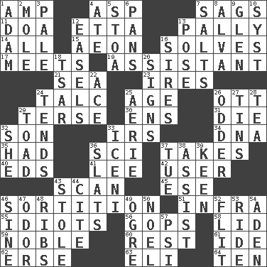 ACROSS 1. Electrical Unit 4. Cleo's killer 7. Sinks 11. ___ good deed 12. Singer James 13. Friendly 14. 100% 15. A really long time 16. Finds the solution 17. Confronts 19. Helper 21. Ocean 23. Angers 24. Baby powder 25. Grow older 26. Baseball player Mel 29. Laconic 30. Followers of ems 31. Pass on 32. Male child 33. Big collection agency 34. Heredity factor (abbr.) 35. Possessed 36. _-fi 37. Receives possession of 40. Begley and Asner 41. Area sheltered from the wind 42. One who uses or employs something 43. Examine hastily 45. Compass dir. 46. Determination 51. Kind of red light 55. Foolish or stupid persons 56. Republicans 58. Flaplike covering 59. Impressive in appearance 60. Repose 61. Binary compound 62. Celtic language 63. Connecticut Ivy Leaguer 64. "___ Little Indians" DOWN 1. First of billions? 2. Undercover agent 3. Diluted with white 4. Had dinner 5. Portico 6. Baking dishes 7. Table seasonings 8. Inventor's middle name 9. Small, secluded valley 10. System (abbr.) 12. Artist's stands 13. Introduce or present, as a question 16. Male parents of animals 18. Russian ruler of old 20. Attaches a signature 22. Adept person 24. Watches over 25. Nest on high 26. More peculiar 27. Metal containers 28. Beverage made from leaves 29. Frog relative 32. A female animal or person 33. Ancient Celtic tribe of eastern Britain 36. Narrow boards 37. Third day of the wk. 38. Aid 39. Peachy ____! 43. Took without asking 44. Quote 46. Trig term 47. Aroma 48. Chest bones 49. Legendary monster 50. Christmas carol 52. Secret move to avoid paying debts 53. Travel on or in a vehicle 54. An important port of Yemen 57. 23rd letter of the Greek alphabet