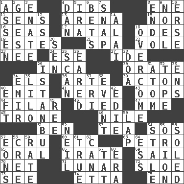 ACROSS 1. Personal question 4. Rights 8. Compass dir. 11. Elected reps. 13. Sports stadium 15. And not 16. Oceans 17. Brizilian seaport 18. Lyric poems 19. _____ Park, CO 21. Health resort 22. Grand slam 23. Born 24. Compass dir. 27. Binary compound 29. South American Indian 30. Declaim 34. Raised railways 36. Johnson of "Laugh-In" 39. NE Massachussets city 40. Give off 41. Boldness 43. I made a mistake 44. Having threads 46. Passed on 47. Madame (abbr.) 48. Heavy duty weighing machine 49. "Death on the ____" 51. Benjamin's nick name 53. Afternoon social gathering 54. Distress signal 57. Shade of tan 60. And so on (abbr.) 63. Stone: prefix 65. Taken by mouth 66. Feeling or showing extreme anger 69. Travel by water 70. Fish or hair follower 71. Type of eclipse 72. _ gin 73. Perceive with the eye 74. Singer James 75. Conclude DOWN 1. NE Netherlands city 2. Honkers 3. Maternal 4. Daniel's nick name 5. Retirement account (abbr.) 6. Antes 7. Fastener 8. Inside; within (prefix) 9. Christmas carol 10. Celtic language 12. Compass dir. 14. Jai _ 18. Conquer 20. Elected rep. 25. Glance over 26. Having ears or earlike features 28. ___ good deed 29. Byzantium, centuries later 31. Smallest unit of an element 32. Drink excessively 33. Followers of ems 34. Independent ruler or chieftain 35. _ and Stitch 37. Three (prefix) 38. Happening 40. Newt 42. Singer Brickell 45. To separate or throw off 50. Infant locale 52. Famous astronaut Armstrong 54. Lacking originality or spontaneity 55. Greek mythologigal hunter 56. Having a sole or soles 57. Immeasurably long periods of time 58. Algonquian 59. Assign a rank or rating to 61. Loyal 62. Patter 64. Curvy letter 67. Make lace 68. Epoch