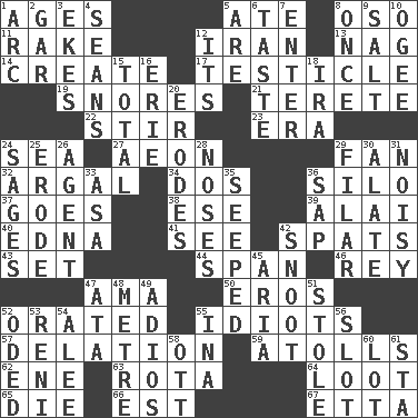 ACROSS 1. Grows older 5. Had dinner 8. Bear (Spanish) 11. Immoral or dissolute person 12. SW Asia republic 13. Tired old horse 14. Make 17. One of the two male reproductive glands 19. Sounds asleep 21. Cigar-shaped 22. Disorderly outburst 23. Epoch 24. Ocean 27. Period of immesurable duration 29. Air blower 32. Therefore, facetiously 34. Two (Sp.) 36. Grain storage tower 37. Moves 38. Compass dir. 39. Mountain range southwest of Kyrgyzstan 40. Pulitzer Prize-winning author Ferber 41. Observe 42. Arguments over trivial matters 43. Arrange properly for use 44. Connect, as a bridge 46. Marina Del _, California 47. Housemaid (var.) 50. Greek god of love 52. Spoke pompously 55. Foolish or stupid persons 57. Conveyance 59. Ringlike coral islands and reefs 62. Compass dir. 63. Round or rotation of duties 64. Plunder 65. Expire 66. Eastern Standard Time (abbr.) 67. Singer James DOWN 1. Curve 2. Slender fish 3. Supplements with great effort 4. Actors Connery and Penn 5. "We ___ not amused" (Victoria) 6. Clothes sense 7. Keyboard key 8. Single time 9. Table seasoning 10. Double curve, resembling the letter S 12. ___ a Wonderful Life 15. "_____ Recall" 16. 4th largest of the Great Lakes 18. Retirement account (abbr.) 20. Eats (away) 24. Gurus 25. Wear away 26. Rep 28. Olfactory organs 29. Having threads 30. Having winglike extensions 31. Annoyingly loud 33. White ___ sheet 35. Oozed 36. Plant excrement 42. Snout, nose 45. Operatic vocal solo 47. "One Day ___ Time" 48. Distance measurement (Brit.) 49. Goodbye (Sp.) 51. Took without asking 52. Wrote a lyric poem 53. Painter Guido (1575-1642) 54. Toward shelter 55. _ tizzy (2 wds.) 56. Position in a hierarchy or organization 58. Baseball player Mel 60. Car dealer's back yard 61. R.R. building