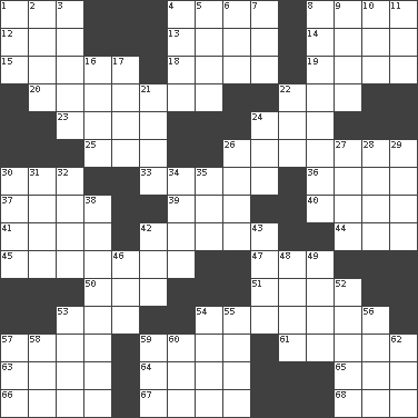 ACROSS 1. Cut the grass 4. Post 8. The Jewish people; Israel 12. Personal question 13. An important port of Yemen 14. Stockings 15. Distinguishing feature 18. It may be bright or harebrained 19. Small Philippine buffalo 20. Tendancy to err 22. Begley and Asner 23. "Two Mules for Sister ____" 24. Flowery wreath 25. And not 26. Commissioned military rank 30. Leather borer 33. Dice game 36. Grain storage tower 37. Spoils 39. It is 40. Cook's measure (abbr.) 41. Johnson of "Laugh-In" 42. Collect or gather 44. Mayday 45. Thinks logically 47. Chop off 50. Three (prefix) 51. A single undivided whole 53. Nervous spasm 54. Leopard's kin 57. Actor Baldwin 59. Son of Isaac 61. Tear up 63. Lick closed 64. Flatfish 65. Declare 66. Introduce or present, as a question 67. Disposed of to a purchaser 68. Binary compound DOWN 1. Floor covering 2. Legendary monster 3. Puts on (as clothing) 4. Ketch in the Levant 5. Whirlpool 6. Born 7. Heredity factor (abbr.) 8. Most dubious of character or honesty 9. Charged particles 10. Bear (Spanish) 11. Teachers' org. 16. SW Asia republic 17. Edible starchy tuberous root 21. Drug cop 22. Car or cant ending 24. French article 26. Global Positioning Systems (abbr.) 27. Chest bones 28. In addition 29. Chops off 30. Having or resembling wings 31. Had on 32. Globular water bottle used in Asia 34. Basketball hoops 35. "One Day ___ Time" 38. A testis 42. Black tropical American cuckoo 43. Turn sharply 46. The grampus (Milton) 48. Singles 49. Essential or central part 52. Tarsus (plural) 53. Beverages made from leaves 54. Give a ring to 55. Took on color 56. Froth on beer 57. Viper 58. Lion 59. Curvy letter 60. "Barney Miller" actor Jack 62. Color
