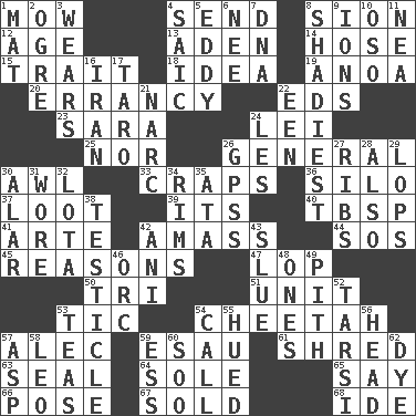 ACROSS 1. Cut the grass 4. Post 8. The Jewish people; Israel 12. Personal question 13. An important port of Yemen 14. Stockings 15. Distinguishing feature 18. It may be bright or harebrained 19. Small Philippine buffalo 20. Tendancy to err 22. Begley and Asner 23. "Two Mules for Sister ____" 24. Flowery wreath 25. And not 26. Commissioned military rank 30. Leather borer 33. Dice game 36. Grain storage tower 37. Spoils 39. It is 40. Cook's measure (abbr.) 41. Johnson of "Laugh-In" 42. Collect or gather 44. Mayday 45. Thinks logically 47. Chop off 50. Three (prefix) 51. A single undivided whole 53. Nervous spasm 54. Leopard's kin 57. Actor Baldwin 59. Son of Isaac 61. Tear up 63. Lick closed 64. Flatfish 65. Declare 66. Introduce or present, as a question 67. Disposed of to a purchaser 68. Binary compound DOWN 1. Floor covering 2. Legendary monster 3. Puts on (as clothing) 4. Ketch in the Levant 5. Whirlpool 6. Born 7. Heredity factor (abbr.) 8. Most dubious of character or honesty 9. Charged particles 10. Bear (Spanish) 11. Teachers' org. 16. SW Asia republic 17. Edible starchy tuberous root 21. Drug cop 22. Car or cant ending 24. French article 26. Global Positioning Systems (abbr.) 27. Chest bones 28. In addition 29. Chops off 30. Having or resembling wings 31. Had on 32. Globular water bottle used in Asia 34. Basketball hoops 35. "One Day ___ Time" 38. A testis 42. Black tropical American cuckoo 43. Turn sharply 46. The grampus (Milton) 48. Singles 49. Essential or central part 52. Tarsus (plural) 53. Beverages made from leaves 54. Give a ring to 55. Took on color 56. Froth on beer 57. Viper 58. Lion 59. Curvy letter 60. "Barney Miller" actor Jack 62. Color