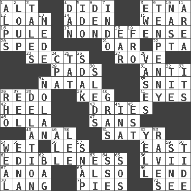 ACROSS 1. Keyboard modifier key 4. "You Light Up My Life" star Conn 8. Inactive volcano in Sicily 12. Rich soil 14. Arabian gulf 15. Put on (as clothing) 16. Whine 17. Unrelated to defense, as in spending 20. Drove too fast 21. Rowing implement 22. Parent Teacher Association (abbr.) 23. Religious groups 27. Be footloose 29. Groovy apts. 31. Opposed to 34. Brizilian seaport 35. In a ____ (agitated or irritated) 36. Make new 39. Barrel 41. Snake ____ (dice throw) 42. Person who is morally reprehensible 43. Frees from moisture 46. Rounded earthenware pot or jar 47. Without 48. Of or related to the anus 51. Letch 54. Soggy 56. French article 58. Compass direction 61. The property of being fit to eat 66. 57 in ancient Rome 67. Small Philippine buffalo 68. In addition 69. Grant temporary use of 70. Austrian-born American filmmaker Fritz 71. Sliced desserts 72. Perceive with the eye DOWN 1. High mountains 2. Central Nebraska county 3. Lies 4. Daniel's nick name 5. Wedding promise 6. Lair 7. _ china 8. She-sheep 9. 3-inch nail 10. Political cartoonist Thomas 11. Length times width 13. Ancient Persian 18. Ewer handle 19. From 24. Numbers guy (abbr.) 25. Make lace 26. Neighbor of Neb. 28. Flower holders 30. Bobsleighs 32. Standoff 33. ___ a Wonderful Life 34. Pitcher Ryan 36. 17th letter of the Greek alphabet 37. Snakelike fish 38. Accusation by an informer 40. Pate de foie ____ 44. _ tizzy (2 wds.) 45. Eastern Standard Time (abbr.) 49. 100% 50. Area sheltered from the wind 52. Shout 53. All-night dance parties 54. Welt 55. Pulitzer Prize-winning author Ferber 57. Fastener 59. Trig term 60. Periodic rise and fall of the sea level 62. Paper or plastic container 63. Connecticut Ivy Leaguer 64. Compass dir. 65. Distress signal
