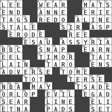 ACROSS 1. Area sheltered from the wind 4. Put on (as clothing) 8. Floor protectors 12. Conclusion 13. Singer Murray 14. 4th largest of the Great Lakes 15. Labels 17. Do over again 18. Place in a line 19. Having lost freshness 21. Title for a knight 23. Viper 24. Wear away 26. To riddle 28. Son of Isaac 30. Nineveh was its capital 34. English channel? 37. Fastener 39. Merit 40. Snakelike fish 41. The easternmost of the Lesser Sundas 43. Make lace 44. (Had) reclined 46. Pacific island yam 47. Followers of ems 48. Contrary to your interests or welfare 51. Heavy book 54. Small child 55. Laconic 58. Basketball assoc. 61. Fifth month 63. Sadhe (variant) 65. Fourth or lowest deck 67. Morally bad or wrong 71. Mild oath 72. Shrivel 73. Actor's bit 74. Biblical high priest 75. Inactive volcano in Sicily 76. Writing tablets 77. Put into a specified state DOWN 1. Allows 2. Maternal 3. _ Allan Poe 4. Armed conflict 5. Compass dir. 6. Added to 7. Vintage cars 8. Cartoonist voice _ Blanc 9. Roberta Peters solo 10. Canisters 11. Ooze 16. A type of plum 18. Ancient Greek god of war 20. Begley and Asner 22. Big collection agency 25. 90 degrees 27. Sight organ 29. Join together 30. To the left, to Queeg 31. Pace 32. SW Asia republic 33. Pismires 34. Actor Lugosi 35. Necklace unit 36. 154 in Roman numerals 38. Wet nurse (var.) 42. Carrot, for example 45. Remaining after all deductions 49. Play 50. R.R. building 52. Was introduced to 53. Celtic language 56. Gurus 57. Peak District village in England 58. Sense of smell 59. Cy Young winner Saberhagen 60. Actor Alda or Thicke 62. Sharp bark 64. Prepare for publication 66. Mouth or opening 68. By way of 69. Working for oneself (abbr.) 70. French article