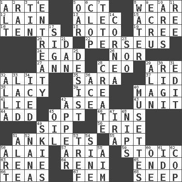 ACROSS 1. Johnson of "Laugh-In" 5. Sep. follower 8. Erode 12. (Had) reclined 13. Actor Baldwin 15. 1/640 square mile 16. Portable shelters 18. Printing process, for short 19. Relationship diagram 20. To free from 22. Son of Zeus who helped slay Medusa 24. Mild oath 26. Not either 27. Singer Murray 28. Corporate head (abbr.) 29. "We ___ not amused" (Victoria) 32. Set down 35. "Two Mules for Sister ____" 37. Flaplike covering 38. Made of lace 39. Frozen water 40. Wise men 41. Whopper 42. Toward the sea 43. A single undivided whole 44. Say or write further 45. Choose 46. Airtight sealed metal containers 49. Small drink 50. 4th largest of the Great Lakes 51. Short socks 55. Fitting 56. Jai _ 57. Operatic vocal solo 59. Unemotional 63. French philosopher Descartes 64. Painter Guido (1575-1642) 65. Inside; within (prefix) 66. Beverages made from leaves 67. Opposite of masc. 68. Ooze DOWN 1. The first octave above the treble staff 2. Actress Charlotte 3. Metal container 4. Plea 5. Rowing implement 6. Hoof sound 7. Wig 8. Wetness 9. Shade of tan 10. Ancient Greek god of war 11. To separate or throw off 14. Pupil covering 17. Attach a signature 21. Daniel's nick name 23. "Barney Miller" actor Jack 25. Cease 28. Cause to be 29. Actor Alda or Thicke 30. Swiss mountan, "Queen of the Mountains" 31. Prepare for publication 32. Silent film actress Nazimova 33. Put down 34. On the rocks 36. Adept person 40. French bagpipes 42. Seem 45. Petroleum 47. Retirement account (abbr.) 48. Pinches, bites 49. Atmospheres 51. Toward shelter 52. Grandmother 53. Not kosher 54. Trig term 56. Nonscientific branch of learning 58. Direct toward a target or goal 60. Single 61. Binary compound 62. Police officer (slang)