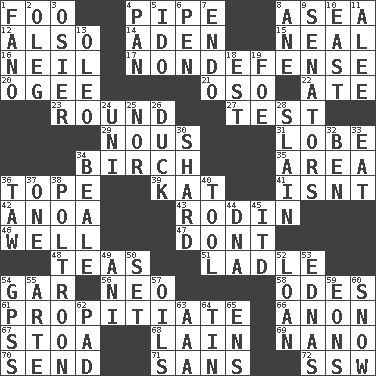 ACROSS 1. Egg _ yung 4. Corncob 8. At sea 12. In addition 14. An important port of Yemen 15. Be tempered by heat 16. Famous astronaut Armstrong 17. Unrelated to defense, as in spending 20. Double curve, resembling the letter S 21. Bear (Spanish) 22. Had dinner 23. Having a circular shape 27. Trial 29. Horse sense 31. Ear part 34. A tree used for making furniture 35. Length times width 36. Drink excessively 39. Krazy ___ of comics 41. Is not 42. Small Philippine buffalo 43. "The Thinker" sculptor 46. Water source 47. Do not 48. Beverages made from leaves 51. Dipping utensil 54. Slender fish 56. Modern: prefix 58. Lyric poems 61. Appease 66. At once, immediately (arch.) 67. Portico 68. (Had) reclined 69. Billionth: prefix 70. Transmit 71. Without 72. Compass dir. DOWN 1. Papal veil 2. Cassini of fashion 3. Flexible twig of a willow tree 4. Baking dish 5. Wedding promise 6. Writing instrument 7. Inside; within (prefix) 8. One (Scot) 9. Legislators 10. 90 degrees 11. Toward shelter 13. Margarine 18. Eastern Standard Time (abbr.) 19. Enemy 24. University (slang) 25. And not 26. Evade 28. Killed 30. Pottery fragment 32. Benjamin's nick name 33. Ingest 34. Calif. Air Force Base 36. The 23rd letter of the Hebrew alphabet 37. Single 38. Coward 40. Instrument 44. Heredity factor (abbr.) 45. It would 49. Black tropical American cuckoo 50. Arrange properly for use 52. Grant temporary use of 53. Ferber et al. 54. Global Positioning Systems (abbr.) 55. Johnson of "Laugh-In" 57. Petroleums 59. Immeasurably long periods of time 60. Overwhelm 62. Groovy apt. 63. Auto club (abbr.) 64. Shallow baking pan 65. Followers of ems