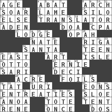 ACROSS 1. Personal question 4. Blind as ____ 8. Bowlike part 12. Fly high 14. Unable to walk 15. Grain storage tower 16. Otherwise 17. Interpreter 20. An important port of Yemen 21. ___ good deed 22. Numbers guy (abbr.) 23. Inn 27. Brightly colored fish 29. Nathan's nickname 31. Capital of Latvia 34. Before Barbara or Clara 35. Adolescent 36. 90 degrees 39. Nonscientific branch of learning 41. Small island 42. Von Bismarck 43. Bert's buddy 46. Indian skirt 47. Tenth: prefix 48. 43,560 square feet 51. Fencing necessities 54. Make lace 56. RI univ. 58. Immeasurably long periods of time 61. Pleas 66. _ gin 67. Small Philippine buffalo 68. Carryall 69. Portable shelter 70. French philosopher Descartes 71. Single time 72. Two (Sp.) DOWN 1. At sea 2. Gilded 3. Artist's stand 4. The first octave above the treble staff 5. Oblong piece of solid material 6. Nanny (var.) 7. Watch over 8. White ___ sheet 9. Actors Guy, Robert Welles, and Clint 10. Hoof sound 11. Israeli folk dance 13. Former U.S. Attorney General Janet 18. "Barney Miller" actor Jack 19. Infant locale 24. Heredity factor (abbr.) 25. Separate the seeds from cotton 26. Singer James 28. Nick name for Arthur 30. Having ears or earlike features 32. Set 33. One (Scot) 34. Unemotional 36. Greek goddess of the dawn 37. "One Day ___ Time" 38. Ski resort town in Vermont 40. Not kosher 44. Non-commissioned officer (abbr.) 45. One more than two 49. Regret 50. Epoch 52. For fear that 53. Having a sole or soles 54. Pull apart 55. Singer Murray 57. "Tell ____ the Marines!" 59. Words to Nanette 60. Puts into a specified state 62. Actress Charlotte 63. Electrically charged atom 64. And so on (abbr.) 65. Perceive with the eye
