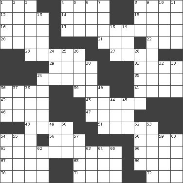 ACROSS 1. Gear tooth 4. Not ill 8. The Jewish people; Israel 12. Blind as ____ 14. At sea 15. Inside; within (prefix) 16. Flatfish 17. Dwellings 20. Peachy ____! 21. Fool 22. Binary compound 23. Goodbye (Sp.) 27. Necklace unit 29. SW Asia republic 31. Ancient Persian 34. Climbing, woody, usually tropical vines 35. Singer Murray 36. In addition 39. Fast jet (abbr.) 41. Slanted text style (abbr.) 42. Allows 43. NE Netherlands city 46. Old wives' tales, e.g. 47. Cowardly lion portrayer 48. Ancient Greek god of war 51. Arrive at 54. Make lace 56. Consenting reply 58. 480, 500 or 516 sheets of paper 61. Pleas 66. Rounded earthenware pot or jar 67. Portico 68. Likelihood 69. Sliced desserts 70. Prong on a fork 71. Introduce or present, as a question 72. Sep. follower DOWN 1. Keg 2. Mitch Miller's instrument 3. An organ shaped like a helmet 4. Armed conflict 5. Compass dir. 6. French article 7. Put down 8. Elected rep. 9. Happening 10. Wrote a lyric poem 11. Olfactory organ 13. Be inclined (to) 18. Pat or tap gently 19. She-sheep 24. One more than two 25. Mouth or opening 26. Without 28. With great haste 30. Rhinal 32. Heredity factor (abbr.) 33. Snakelike fish 34. Failure 36. Everything 37. Lion 38. Ski resort town in Vermont 40. Russian ruler of old 44. A female animal or person 45. Period 49. Sight organ 50. Ocean 52. Riding implement 53. Sun: prefix 54. Trial 55. Opposed to 57. Constrict 59. Actor Baldwin 60. Vertical spar for supporting sails 62. Actress Charlotte 63. Wedding promise 64. Begley and Asner 65. Compass dir.