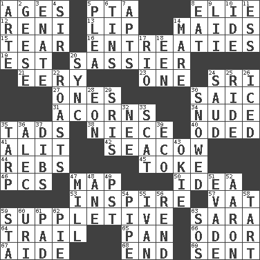 ACROSS 1. Ripens 5. Parent Teacher Assoc. 8. Writer Wiesel 12. Painter Guido (1575-1642) 13. Mouth edge 14. Women servants 15. Pull into pieces 16. Pleas 19. Eastern Standard Time (abbr.) 20. More impudent 21. Suggestive of the supernatural 23. Single 24. Indian title of respect (Mr.) 27. Singles 30. Ketch in the Levant 31. Oak nuts 34. Naked 35. Small amounts or degrees 38. Sibling's daughter 40. Wrote a lyric poem 41. Came down and settled, as after flight 42. Manatee 44. Confederate soldiers (slang) 45. Puff or smoke 46. Personal Computers (abbr.) 47. Atlas unit 50. The main thing one is thinking about 53. Heighten or intensify 57. Large container 59. Supplying deficiencies 63. "Two Mules for Sister ____" 64. Go after with the intent to catch 65. Baking dish 66. Aroma 67. Helper 68. Conclusion 69. Transmitted DOWN 1. Johnson of "Laugh-In" 2. Honkers 3. Related on the mother's side 4. Title for a knight 5. Entreaty 6. Canisters 7. Tenement units (abbr.) 8. Ingest 9. Cards in a Roman deck? 10. Binary compound 11. Curvy letter 14. Female horse 17. River (Sp.) 18. Car or cant ending 20. Synchronize (abbr.) 22. Ridicules or criticizes harshly 24. Saudi Arabian king (1953-1964) 25. Travel on an animal 26. On the rocks 28. A really long time 29. Indian titles of respect 30. Overwhelmed 32. Born 33. Leave at once 35. Canvas cover 36. Actor Baldwin 37. Claim 39. Environmental prefix 43. Migrant worker of the '30s 47. Place where flour is made 48. One (Scot) 49. Pacific Standard Time (abbr.) 51. Elude 52. Composer Copland 54. Corncob 55. _ the terrible 56. Tear apart 58. Small pie 59. R.R. building 60. RI univ. 61. Groovy apt. 62. Sliced dessert 63. Mayday