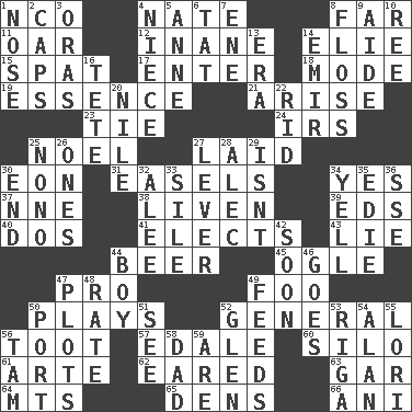 ACROSS 1. Non-commissioned officer (abbr.) 4. Nathan's nickname 8. At a great distance 11. Rowing implement 12. Silly 14. Writer Wiesel 15. Argument over a trivial matter 17. Keyboard key 18. Method 19. Center 21. Ascend 23. Standoff 24. Big collection agency 25. Christmas carol 27. Put down 30. Period of immesurable duration 31. Artist's stands 34. It is so 37. Compass dir. 38. Make or become more lively 39. Begley and Asner 40. Two (Sp.) 41. Opts 43. Whopper 44. Fermented drink made from hops 45. Stare at amorously 47. Adept person 49. Egg _ yung 50. Romps 52. Commissioned military rank 56. A blast of a horn 57. Peak District village in England 60. Grain storage tower 61. Johnson of "Laugh-In" 62. Having ears or earlike features 63. Slender fish 64. Mountains (abbr.) 65. Lairs 66. Cuckoo DOWN 1. Olfactory organ 2. Smile enhancers 3. Mouths or openings 4. Sibling's daughter 5. Singer Murray 6. Make lace 7. Compass dir. 8. Soft thread for cleaning between teeth 9. Assistant 10. To riddle 13. Period 14. Independent ruler or chieftain 16. Wig 20. The longest river in the world 22. To free from 25. Words to Nanette 26. Washington bills 27. Crowbar 28. Actor Baldwin 29. Is not 30. Conclusion 32. Toward shelter 33. Drop; flow; fall 34. Shout 35. Singer Brickell 36. Compass dir. 42. Within a short period 44. Male child 46. Leaves 47. Schemes 48. Assign a rank or rating to 49. Eats 50. Sweet dark-red dessert wine 51. Observe 52. Small, secluded valley 53. Port city in Latvia 54. Actor Alda or Thicke 55. Australian parrot (variant) 56. Scottish cap 58. June honoree 59. "We ___ not amused" (Victoria)
