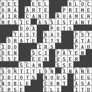 ACROSS 1. To riddle 4. Snakelike fish 7. Coalition 11. Mouth or opening 12. Johnson of "Laugh-In" 13. First class 14. Atmosphere 15. Patter 16. Wanderer 17. Of or pertaining to a meson 19. Aide 21. ___ good deed 23. Plant holders 24. Trial 25. Krazy ___ of comics 26. Pacific Standard Time (abbr.) 29. Speak pompously 30. ___ a Wonderful Life 31. _ moment's notice (2 wds.) 32. Wedding promise 33. Big collection agency 34. Groovy apt. 35. Lair 36. _-fi 37. Eucharist need 40. Compass dir. 41. Car or cant ending 42. One who makes use of a thing 43. Skim 45. Compass dir. 46. Drawing lots 51. Silly 55. Foolish or stupid persons 56. Common sense 58. Part of a journey 59. Impressive in appearance 60. Penny 61. White ___ sheet 62. Celtic language 63. Biblical high priest 64. It would DOWN 1. Wander 2. 4th largest of the Great Lakes 3. Hearing organs 4. Epoch 5. Inactive volcano in Sicily 6. Allows 7. Naughty children 8. Pale green bean 9. Sign of things to come 10. Certainty 12. Buttonhole 13. Mail 16. Debaucheries 18. The main thing one is thinking about 20. Arguments over trivial matters 22. Had dinner 24. Marketplace scale 25. Japanese brewing company 26. Some stationery 27. Comedian Laurel of Laurel & Hardy 28. Small boy 29. Lyric poems 32. Binary compound 33. Ancient Celtic tribe of eastern Britain 36. Theater features 37. Fluid product of inflammation 38. Help 39. Adolescent 43. Took without asking 44. Quote 46. Trig term 47. Aroma 48. Chest bones 49. Single time 50. Christmas carol 52. Jai _ 53. Egg locale 54. Mild oath 57. Single; one (prefix)