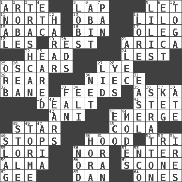 ACROSS 1. Johnson of "Laugh-In" 5. Infant locale 8. Allow 11. Compass direction 13. Chief or king in Benin or Nigeria 14. _ and Stitch 15. Phillipine bananalike plant 16. Storage container 17. Cassini of fashion 18. French article 19. Remainder 21. N. Chile seaport 22. Froth on beer 24. For fear that 25. Motion picture awards 27. Sodium hydroxide 29. Located in or toward the back 30. Sibling's daughter 32. Object of repulsion 33. Gives food to 35. "____ silly question..." 39. Started a card game 41. Proofreading order 42. Black tropical American cuckoo 43. Develop 45. Play the lead 48. Root beer relative 49. Ceases 50. Parka part 52. Three (prefix) 55. Australian parrot (variant) 56. Not either 57. Keyboard key 59. _ mater 60. Mouth or opening 61. Biscuitlike quick bread 62. Unit of force equal to gravity 63. Daniel's nick name 64. Washington bills DOWN 1. Of or related to the anus 2. Loose flowing garment 3. File 13 4. And so on (abbr.) 5. Tennis shots 6. "This won't hurt ____!" 7. Baking dish 8. Ms. Damita and namesakes 9. Opt 10. Ancient Roman robe 12. Ethiopian city, capital of Harari 14. Old wives' tales, e.g. 20. Begley and Asner 21. Actor Baldwin 23. Having ears or earlike features 25. Globe 26. Ocean 27. Flaplike covering 28. It is so 30. Fish or hair follower 31. Artist's stand 33. Avid follower 34. Connecticut Ivy Leaguer 36. Ski resort town in Vermont 37. Barrel 38. Had dinner 40. Hearing organs 43. Environmental prefix 44. Methods 45. Fur scarf 46. Singer Mel 47. Capital of Western Samoa 49. Volcanic refuse 50. Israeli folk dance 51. Northwest Algerian city 53. French philosopher Descartes 54. Angers 56. Dreamland 58. Non-commissioned officer (abbr.)