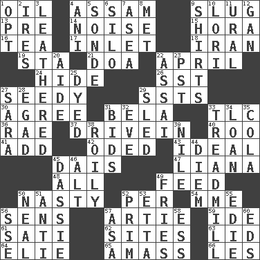 ACROSS 1. Petroleum 4. Indian state 9. A hard, heavy blow 13. Before (prefix) 14. Annoying sound 15. Israeli folk dance 16. Beverage made from leaves 17. An arm off of a larger body of water 18. SW Asia republic 19. R.R. building 21. ___ good deed 22. Showery time 24. Flintstone garb 26. Fast jet (abbr.) 27. Morally degraded 29. Fast planes 30. Match 31. Actor Lugosi 33. Affectionate concern, for short 36. Actress Charlotte 37. Popular '50s hangout 40. Friend of Pooh 41. Say or write further 42. Wrote a lyric poem 43. Perfect 45. Raised platform 47. Climbing, woody, usually tropical vines 48. Everything 49. Nourish 50. Smutty 52. For each 54. Madame (abbr.) 56. Elected reps. 57. Nick name for Arthur 59. Binary compound 61. Suttee (variant) 62. Settings 63. Flaplike covering 64. Writer Wiesel 65. Collect or gather 66. French article DOWN 1. Choose 2. Angers 3. Resembling or made to resemble leather 4. Cuckoo 5. Something which is sent 6. Grain storage tower 7. At sea 8. Was introduced to 9. Upper-body garments 10. Australian parrot (variant) 11. Mountain range 12. Separate the seeds from cotton 20. Assistant 22. Slender Brazilian palm 23. Pacific Standard Time (abbr.) 25. Colored 27. "Two Mules for Sister ____" 28. Mild oath 29. Downhill vehicle 31. Auction offers 32. First lady 33. Excercise machine 34. Grant temporary use of 35. Root beer relative 38. Agitated, as a liquid 39. Mediterranean tributary 44. South Vietnam president (1954) 45. Small ungulate mammals of Africa 46. The first octave above the treble staff 49. Strips of potato fried in deep fat 50. Be tempered by heat 51. Against 52. Demure 53. Singer James 55. Singer Brickell 56. Compass dir. 57. White ___ sheet 58. Double-curved letter 60. Begley and Asner