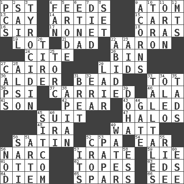 ACROSS 1. Pacific Standard Time (abbr.) 4. Eats 9. Tiny particle 13. Island 14. Nick name for Arthur 15. Draw slowly or heavily 16. Title for a knight 17. Music written for nine 18. Mouths or openings 19. Car dealer's back yard 21. Male parent 22. Composer Copland 24. Quote 26. Storage container 27. Capital of Egypt 29. Hats (slang) 30. Tree or shrub in the Birch family 31. Necklace unit 33. Small child 36. 23rd letter of the Greek alphabet 37. Borne 40. According to 41. Manchild 42. Lightbulb-shaped fruit 43. Stared 45. Set or collection 47. Rings 48. Retirement account (abbr.) 49. Electrical Unit 50. Smooth fabric 52. Tax preparer (abbr.) 54. Hearing organ 56. Drug cop 57. Feeling or showing extreme anger 59. Falsehood 61. Von Bismarck 62. Drinks excessively 63. Begley and Asner 64. South Vietnam president (1954) 65. Practice fights 66. Observe DOWN 1. Personal Computers (abbr.) 2. Travel by water 3. Polypeptide antibiotic 4. Air blower 5. Eat (away) 6. Inactive volcano in Sicily 7. Passed on 8. Put into a specified state 9. Oak nuts 10. Edible starchy tuberous root 11. Northwest Algerian city 12. Mountains (abbr.) 20. Hoop that covers a wheel 22. Tolerate 23. Assist 25. Torque (variant) 27. Smile enhancers 28. In addition 29. Den 31. Cy Young winner Saberhagen 32. Period 33. Baron Munchausen's specialties 34. Margarine 35. Small boys 38. Bee-related 39. Capital of the state of Qatar 44. Yard entry 45. "Cheers" or "Ellen" 46. RI univ. 49. Wetness 50. Suttee (variant) 51. Johnson of "Laugh-In" 52. Riding implement 53. Dad 55. Travel on or in a vehicle 56. Allow head to fall sleepily 57. It is 58. Curvy letter 60. Compass dir.