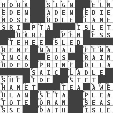 ACROSS 1. Israeli folk dance 5. Signal 9. Shade tree 12. Paradise 13. Arabian gulf 14. Singer Brickell 15. Sense of smell 16. Hero or heavy, e.g. 17. Unable to walk 18. Indian title of respect (Mr.) 19. Parent Teacher Association (abbr.) 21. Small island 22. Have the gumption 24. Fenced enclosure 26. Curvy letter 27. Giggle 28. Downhill vehicle 29. French philosopher Descartes 30. Relating to or accompanying birth 32. Inactive volcano in Sicily 36. South American Indian 37. Greek goddess of the dawn 38. Precipitation 39. Wrote a lyric poem 40. A-one 42. Rounded earthenware pot or jar 43. Ketch in the Levant 44. Dipping utensil 46. A female animal or person 49. Binary compound 50. Proofreading order 51. French painter Edouard 53. Afternoon social gathering 54. Deep reverence 57. Uhlan (variant) 58. Stalk of a moss capsule 61. Entreaty 62. Haul 63. Northwest Algerian city 64. Oceans 65. Compass dir. 66. Pledge 67. Capri or Wight DOWN 1. Coop moms 2. Scent 3. Home 4. One (Scot) 5. "Two Mules for Sister ____" 6. Wedding promise 7. Set 8. Compass dir. 9. Peak District village in England 10. Citrus fruits 11. Confronts 14. Raised railways 19. Before (prefix) 20. Adolescent 21. Indiana (abbr.) 23. Forward in time 24. Suffix with ecto or cyto 25. Snakelike fish 27. Be inclined (to) 28. Unemotional 29. _ de Janeiro 31. Nest on high 32. Eat (away) 33. Baron Munchausen's specialties 34. "Death on the ____" 35. Santa ___, CA 40. Writing tablet 41. Otherwise 43. Be seated 45. _ moment's notice (2 wds.) 46. Obscenities 47. Rings 48. Maternal 52. Compass dir. 53. Hyperbolic tangent 55. Welt 56. Relaxation 58. "Barney Miller" actor Jack 59. Epoch 60. Make lace 61. Air pressure measure (abbr.)