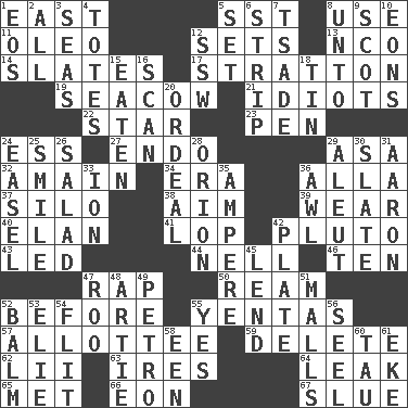 ACROSS 1. Compass direction 5. Fast jet (abbr.) 8. Purpose 11. Margarine 12. Puts into a specified state 13. Non-commissioned officer (abbr.) 14. Chalkboards 17. Ski resort town in Vermont 19. Manatee 21. Foolish or stupid persons 22. Play the lead 23. Writing instrument 24. Double-curved letter 27. Inside; within (prefix) 29. White ___ sheet 32. At full speed 34. Epoch 36. Silent film actress Nazimova 37. Grain storage tower 38. Direct toward a target or goal 39. Put on (as clothing) 40. Style 41. Trim (branches) 42. Greek god of the underworld 43. Directed 44. 1994 drama film starring Jodie Foster 46. Nine, plus one 47. Reproach for some lapse or misdeed 50. 480, 500 or 516 sheets of paper 52. Prior to 55. Gossips 57. One to whom something is allotted 59. Keyboard key 62. Cards in a Roman deck? 63. Angers 64. Path through which fluid escapes 65. Was introduced to 66. Period of immesurable duration 67. Turn sharply DOWN 1. Greek goddess of the dawn 2. 100% 3. Oceans 4. Lugs 5. Put into a specified state 6. Long narrow piece of something 7. Sadhe (variant) 8. To (old English) 9. Native of Scotland 10. Immeasurably long periods of time 12. Compass dir. 15. Ingested 16. Examine minutely or intensely 18. Shallow baking pan 20. Severe or trying experience 24. Artist's stand 25. Grin 26. Vegetable dish 28. Greek mythologigal hunter 29. Native American of Southwest Alaska 30. Schedule 31. Composer Copland 33. Electrically charged atom 35. Electrical Unit 36. Leather borer 42. Food holder 45. Grant temporary use of 47. Friend of Pooh 48. Nick name for Arthur 49. Stone: prefix 51. Shopping centers 52. Lip ointment 53. Writer Wiesel 54. Sudden quick movement 55. Consenting reply 56. Sew up the eyelids of hawks and falcons 58. Car or cant ending 60. The 19th letter of the Greek alphabet 61. Supplement with great effort