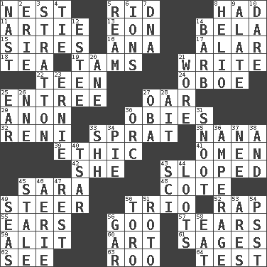 ACROSS 1. Egg locale 5. To free from 8. Possessed 11. Nick name for Arthur 13. Period of immesurable duration 14. Actor Lugosi 15. Fathers 16. Santa ___, CA 17. Having or resembling wings 18. Beverage made from leaves 19. Scottish caps 21. Compose 22. Adolescent 24. Mitch Miller's instrument 25. Main course 27. Boat paddle 29. At once, immediately (arch.) 30. Off-Broadway awards 32. Painter Guido (1575-1642) 33. Small fatty European fish 35. Nanny 39. Moral principle 41. Sign of things to come 42. A female animal or person 43. Slanted 45. "Two Mules for Sister ____" 48. ____ d'Azur (French Riviera) 49. Bull 50. Musical group of three 52. Reproach for some lapse or misdeed 55. Hearing organs 56. Thick or sticky substance 57. Rends 59. Set down 60. Nonscientific branch of learning 61. Gurus 62. Observe 63. Friend of Pooh 64. Trial DOWN 1. Political cartoonist Thomas 2. 4th largest of the Great Lakes 3. Ski resort town in Vermont 4. Make a knot 5. 480, 500 or 516 sheets of paper 6. Charged atoms 7. Heredity factor (abbr.) 8. Sun: prefix 9. Having winglike extensions 10. Have the gumption 12. First name in cosmetics 14. Sharp remark 20. A saturated hydrocarbon 21. Had on 23. Bert's buddy 25. Hearing organ 26. Compass dir. 27. Chief or king in Benin or Nigeria 28. Small island 30. The grampus (Milton) 31. Snob 33. Quiet! 34. Sliced dessert 36. Electrical Measurement 37. Born 38. Added to 40. Russian ruler of old 43. _-fi 44. Plunders 45. Lacking originality or spontaneity 46. Nest on high 47. Respite 49. Oceans 50. "Corrida" creature 51. Printing process, for short 53. Ancient Greek god of war 54. Inconspicuous attention getter 56. Slender fish 58. Consume
