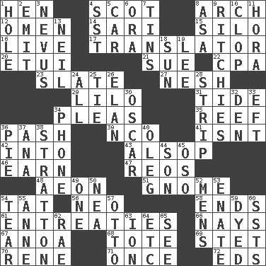ACROSS 1. Layer 4. Highlander 8. Bowlike part 12. Sign of things to come 14. Indian skirt 15. Grain storage tower 16. Not recorded 17. Interpreter 20. Needle case 21. Take to court 22. Accounting whiz (abbr.) 23. Chalkboard 27. Tender 29. _ and Stitch 31. Event that recurs at intervals 34. Entreaties 35. Coral ridge 36. Romantic infatuation 39. Non-commissioned officer (abbr.) 41. Is not 42. To the inside or interior of 43. Columnist Joseph or Stewart 46. Merit 47. Vintage cars 48. A really long time 51. Dwarf 54. Make lace 56. Modern: prefix 58. Extremities 61. Pleas 66. Negative votes 67. Small Philippine buffalo 68. Lug 69. Proofreading order 70. French philosopher Descartes 71. Single time 72. Begley and Asner DOWN 1. Opening into or through something 2. Send forth 3. Mole, birthmark 4. Fast jet (abbr.) 5. Auto 6. Mouth or opening 7. Airtight sealed metal containers 8. White ___ sheet 9. Actors Guy, Robert Welles, and Clint 10. Hoof sound 11. Israeli folk dance 13. Famous astronaut Armstrong 18. Player for Phoenix 19. Area sheltered from the wind 24. Everything 25. Make a knot 26. Liveliness 28. Remove all contents or possession from 30. Witty Wilde 32. Lair 33. Lizard (obsolete) 34. Give a jingle 36. Sliced dessert 37. Santa ___, CA 38. Ski resort town in Vermont 40. Cassini of fashion 44. Male offspring 45. Bear (Spanish) 49. Single 50. Teachers' org. 52. Not women's 53. Related on the mother's side 54. Pull into pieces 55. Queen of England 1702-14 57. "Beetle Bailey" pooch 59. Colored 60. Fast planes 62. Actress Charlotte 63. Electrically charged atom 64. And so on (abbr.) 65. Observe