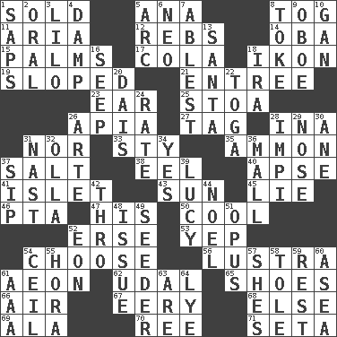 ACROSS 1. Disposed of to a purchaser 5. Santa ___, CA 8. Coat; cloak 11. Roberta Peters solo 12. Confederate soldiers (slang) 14. Chief or king in Benin or Nigeria 15. Insides of hands 17. Root beer relative 18. Visual representation of an object 19. Had an oblique or slanted direction 21. Main course 23. Hearing organ 25. Portico 26. Capital of Western Samoa 27. Label 28. _ tizzy (2 wds.) 31. And not 33. Filthy place 35. ID or VA city 37. Table seasoning 38. Snakelike fish 40. Domed church section 41. Small island 43. Player for Phoenix 45. Falsehood 46. Parent Teacher Assoc. 47. Part of HMS, perhaps 50. Calm and collected 52. Celtic language 53. Slangy assent 54. Opt 56. A period of five years 61. Period of immesurable duration 62. Allodial 65. Imelda's hoard 66. Wind 67. Suggestive of the supernatural 68. Otherwise 69. According to 70. To sift 71. Stalk of a moss capsule DOWN 1. Plant excrements 2. Spoken 3. _ and Stitch 4. Moist 5. Curve 6. Modern: prefix 7. Most capable 8. Puff or smoke 9. Mitch Miller's instrument 10. Separate the seeds from cotton 13. Before Barbara or Clara 16. Ooze 18. Retirement account (abbr.) 20. Raised platform 22. Ancient Roman robe 24. Pace 26. Johnson of "Laugh-In" 28. Body of Kaffir warriors 29. Sense of smell 30. One (Scot) 31. Political cartoonist Thomas 32. Water jar 34. Affirmative reply 36. Shopping center 37. Small drink 39. "I Love _" 42. Through, poetically 44. Christmas carol 48. Come out of 49. Sowing specialist 51. Musical composition 52. Period of immesurable duration 54. To provide with a ceiling 55. Israeli folk dance 57. "______ My Girl" (Turtles hit) 58. Lacquered or enameled metalware 59. Take ten 60. Toward the sea 61. American Automobile Association (abbr.) 63. "We ___ not amused" (Victoria) 64. Sodium hydroxide