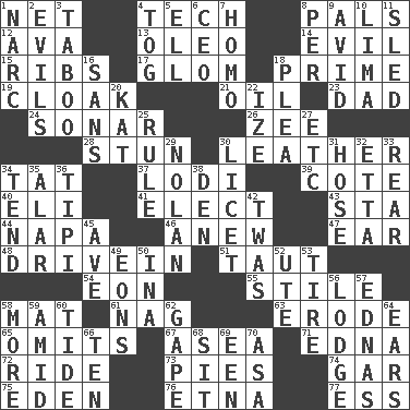 ACROSS 1. Fish or hair follower 4. Technical 8. Friends 12. Actress Gardner 13. Margarine 14. Tending to cause great harm 15. Chest bones 17. Seize upon or latch onto something 18. A-one 19. Anything that covers or conceals 21. Lubricate 23. June honoree 24. Underwater navigation system 26. Last letter of the English alphabet 28. Surprise greatly 30. Cordwainer's material 34. Make lace 37. Farming town in central California 39. ____ d'Azur (French Riviera) 40. Connecticut Ivy Leaguer 41. Opt 43. R.R. building 44. California wine valley 46. Afresh 47. Ewer handle 48. Popular '50s hangout 51. Strained 54. A really long time 55. Vertical member of a panel or frame 58. Floor protector 61. Tired old horse 63. Wear away 65. Leaves out 67. Toward the sea 71. Pulitzer Prize-winning author Ferber 72. Travel on or in a vehicle 73. Sliced desserts 74. Slender fish 75. Genesis locale 76. Inactive volcano in Sicily 77. Double-curved letter DOWN 1. Drug cop 2. Vices 3. Off limits 4. Coat; cloak 5. Pipe bend 6. Corporate head (abbr.) 7. Same (prefix) 8. For each 9. Enthusiastic 10. Pale green bean 11. Downhill vehicle 16. Without 18. Entreaty 20. Krazy ___ of comics 22. Ending with capital 25. Governing power 27. And so on (abbr.) 29. Pitcher Ryan 30. It is permitted: Lat. 31. Flexible conduit 32. Singer James 33. Posterior 34. Look after 35. Having or resembling wings 36. Native american tent (variation) 38. Lair 42. It was, poetically 45. "___ Maria" 49. Immeasurably long periods of time 50. _ tizzy (2 wds.) 52. Shoshoni 53. Become fatigued 56. Cabin 57. Ferber et al. 58. Greater amount 59. Among 60. Periodic rise and fall of the sea level 62. Stare wonderingly 64. Hearing organs 66. "___ Little Indians" 68. Be seated 69. Car or cant ending 70. White ___ sheet