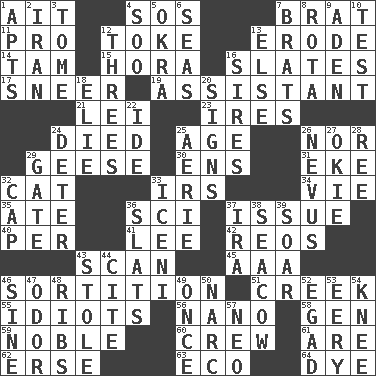 ACROSS 1. Small island 4. Mayday 7. Naughty child 11. Adept person 12. Puff or smoke 13. Eat (away) 14. Scottish cap 15. Israeli folk dance 16. Chalkboards 17. Contemptuous expression 19. Helper 21. Flowery wreath 23. Angers 24. Passed on 25. Grow older 26. Not either 29. Honkers 30. Followers of ems 31. Make supply last 32. Feline 33. Big collection agency 34. Compete 35. Had dinner 36. _-fi 37. Come out of 40. For each 41. Area sheltered from the wind 42. Vintage cars 43. Glance over 45. Auto club (abbr.) 46. Making a chance decision by using lots 51. Small stream 55. Foolish or stupid persons 56. Billionth: prefix 58. Commissioned mil. rank 59. Having high moral qualities 60. Ship's personnel 61. "We ___ not amused" (Victoria) 62. Celtic language 63. Environmental prefix 64. Color DOWN 1. Tenement units (abbr.) 2. SW Asia republic 3. Heavy book 4. "Barney Miller" actor Jack 5. Gumbo ingredient 6. Oceans 7. Naughty children 8. Round or rotation of duties 9. Arabian gulf 10. Trial 12. Threesomes 13. Otherwise 16. Titles for men of rank and authority 18. Writer Wiesel 20. Public displays of written messages 22. Binary compound 24. Prevent from occurring 25. Nest on high 26. Congenital growth or mark on the skin 27. Migrant worker of the '30s 28. Portuguese money of account (variant) 29. Yard entry 32. Head covering 33. Ancient Celtic tribe of eastern Britain 36. Narrow boards 37. Lyricist Gershwin 38. Manatee 39. Fly high 43. Fur scarf 44. Quote 46. Trig term 47. Scent 48. Chest bones 49. At one time in the past 50. Drug cop 52. Mild oath 53. Suggestive of the supernatural 54. Leg joint 57. Modern: prefix