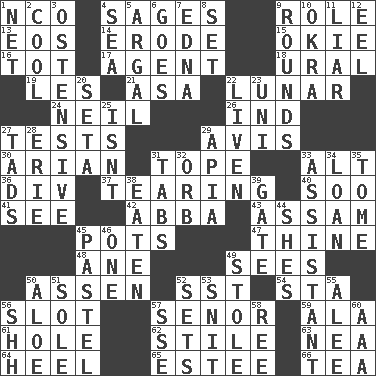 ACROSS 1. Non-commissioned officer (abbr.) 4. Gurus 9. Hero or heavy, e.g. 13. Greek goddess of the dawn 14. Eat (away) 15. Migrant worker of the '30s 16. Small child 17. Representative 18. Mountain range 19. French article 21. White ___ sheet 22. Type of eclipse 24. Famous astronaut Armstrong 26. Indiana (abbr.) 27. Trials 29. Opinion 30. Believer in; advocate of (suffix) 31. Drink excessively 33. The first octave above the treble staff 36. HTML Container Element 37. Lacerating 40. "Barney Miller" actor Jack 41. Perceive with the eye 42. Swedish rock group 43. Indian state 45. Plant holders 47. One or ones belonging to thee 48. A saturated hydrocarbon 49. Perceives with the eye 50. NE Netherlands city 52. Fast jet (abbr.) 54. R.R. building 56. Position in a hierarchy or organization 57. Sir (Sp.) 59. Wing 61. Opening into or through something 62. Vertical member of a panel or frame 63. Teachers' org. 64. Person who is morally reprehensible 65. First name in cosmetics 66. Beverage made from leaves DOWN 1. Remaining after all deductions 2. Calm and collected 3. Clearly or manifestly demonstrative 4. Ocean 5. Therefore, facetiously 6. Travels 7. Pulitzer Prize-winning author Ferber 8. Put into a specified state 9. Periods in a boxing match 10. Gumbo ingredient 11. One who doesn't tell the truth 12. Snakelike fish 20. Bristle 22. Make or become more lively 23. Single; one (prefix) 25. Is not 27. Small amounts or degrees 28. One of the Great Lakes 29. Capital of Western Samoa 31. Bar bills 32. Globe 33. Aide 34. Grant temporary use of 35. Heavy book 38. Consumed 39. Yard entry 44. "______ My Girl" (Turtles hit) 45. Soft color 46. Single 49. Took without asking 50. Medicinal plant 51. Flatfish 52. Puts into a specified state 53. In a ____ (agitated or irritated) 55. Toward shelter 56. Quiet! 57. Compass dir. 58. Portuguese money of account (variant) 60. American Automobile Association (abbr.)