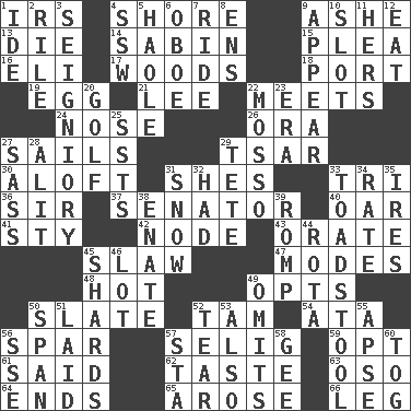 ACROSS 1. Big collection agency 4. Dinah or Pauly 9. American tennis player Robert 13. Expire 14. Unit of acoustic absorption 15. Entreaty 16. Biblical high priest 17. Forest 18. Left side of a ship or aircraft 19. Oval reproductive body of a fowl 21. Area sheltered from the wind 22. Confronts 24. Olfactory organ 26. Mouth or opening 27. Moves on water 29. Russian ruler of old 30. At or to great height 31. "______ My Girl" (Turtles hit) 33. Three (prefix) 36. Title for a knight 37. Elected representative 40. Boat paddle 41. Filthy place 42. Connecting point 43. Speak pompously 45. Cole _ (cabbage dish) 47. Methods 48. Being at a high temperature 49. Chooses 50. Chalkboard 52. Scottish cap 54. "One Day ___ Time" 56. Coast Guard woman 57. Major League Baseball Commissioner Bud 59. Elect 61. Alleged 62. Clothes sense 63. Bear (Spanish) 64. Conclusions 65. Came up 66. Part of a journey DOWN 1. Binary compound 2. Cause heat under the collar 3. Signiory (variant) 4. Compass dir. 5. White Person, in Hawaii 6. Mitch Miller's instrument 7. Travel on an animal 8. Followers of ems 9. Seem 10. Slit 11. Possessive pronoun 12. Erode 20. Eighteen holes 22. With motion or animation 23. Period 25. Fast planes 27. Backtalk 28. Came down and settled, as after flight 29. Wig 31. Overwhelm 32. Possessed 33. Inedible or poisonous agaric 34. Pace 35. Angers 38. Related on the mother's side 39. Play 44. Roll call or roster of names 45. Broken pieces 46. Car dealer's back yard 49. Leaves out 50. Connect, as a bridge 51. Put down 52. Separate forcefully 53. In addition 55. Domed church section 56. Compass dir. 57. R.R. building 58. Unit of force equal to gravity 60. Coat; cloak